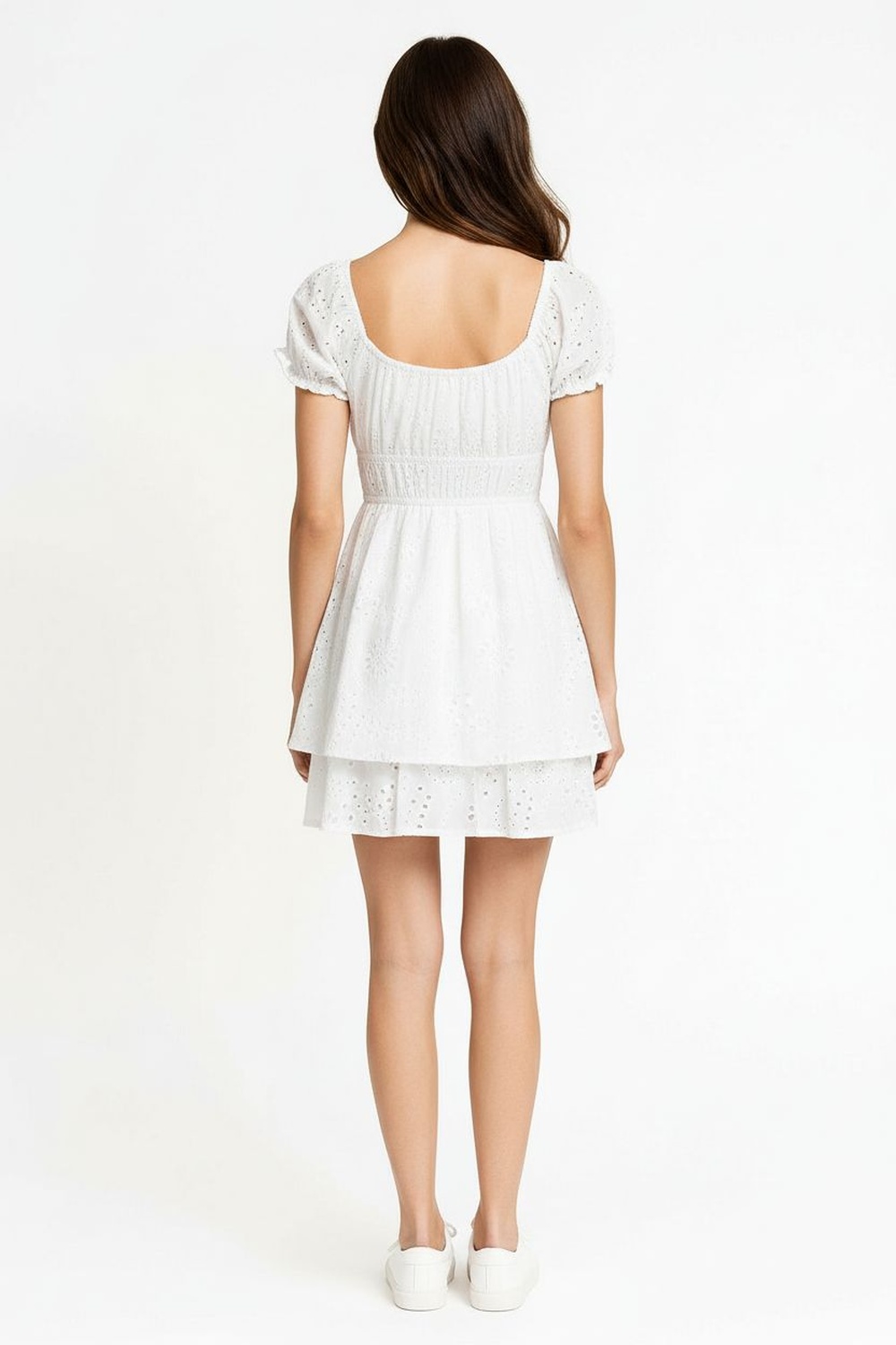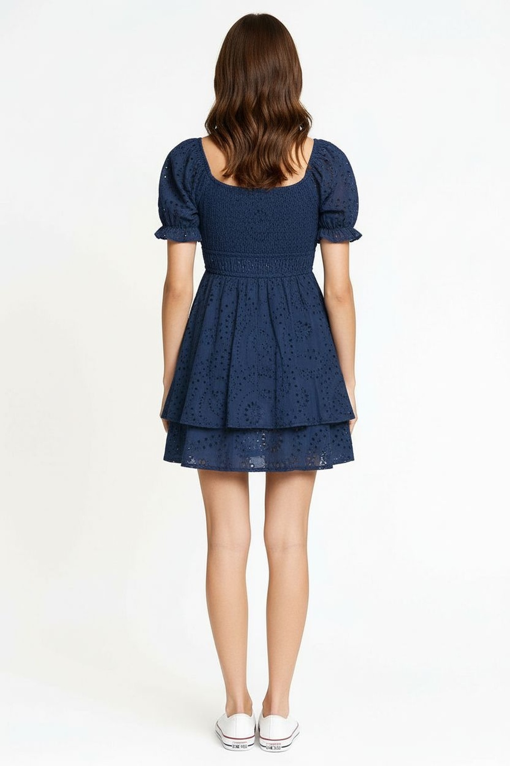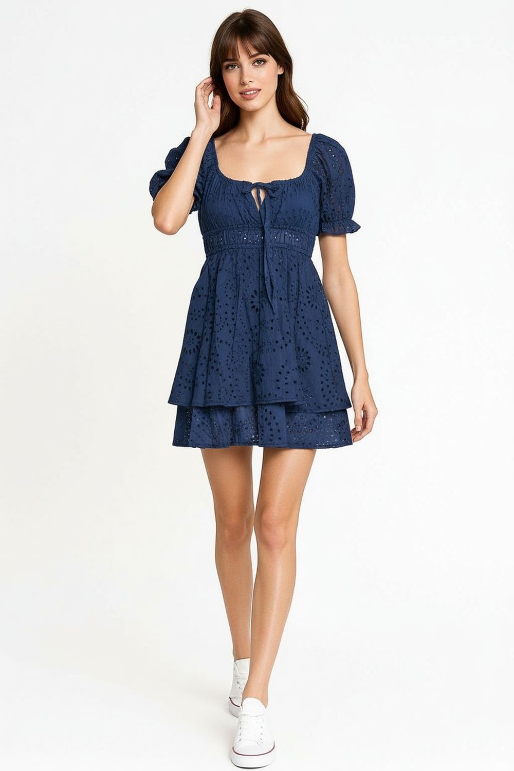 Vestido corto con escote amplio y detalle de amarre frontal que realza el área superior, mangas cortas abullonadas con elástico que brindan ajuste cómodo, corte bajo el busto que estiliza la silueta y falda con ligero vuelo que aporta movimiento, confección ligera con detalles calados que elevan su diseño