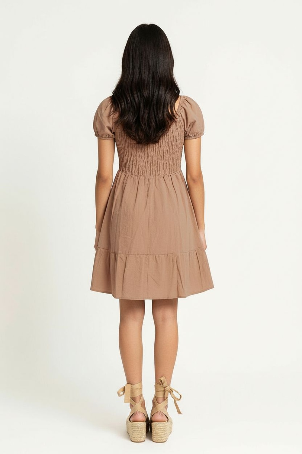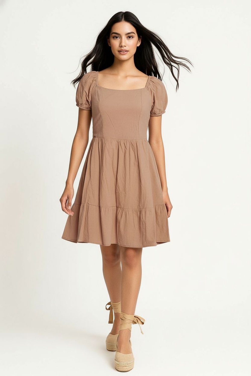 Vestido corto confeccionado en tela tipo manta con textura natural, escote cuadrado que equilibra la silueta, mangas globo con terminación elástica que añaden volumen sutil, falda amplia con caída suave que aporta movimiento y ligereza