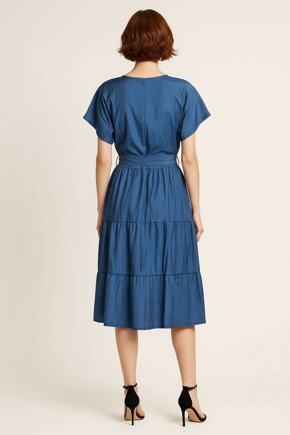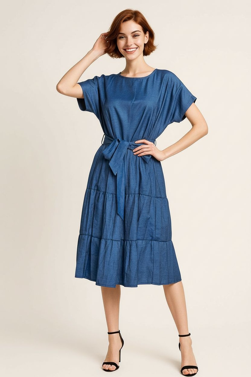 Vestido con manga corta amplia, escote cerrado, cinturón del mismo tejido, falda con cortes en gajos, caída fluida, largo a la rodilla