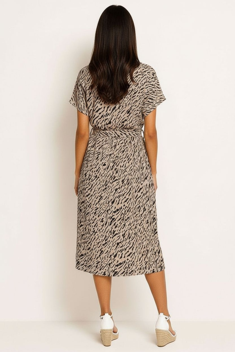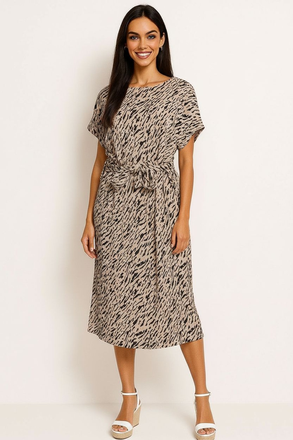 Vestido de manga corta con escote redondo y silueta recta que ofrece comodidad, cinturón integrado del mismo tejido que permite ajustar la cintura y definir la figura, largo a la rodilla con caída fluida que aporta movimiento natural, confección suave al tacto con estructura ligera y ajuste favorecedor al cuerpo