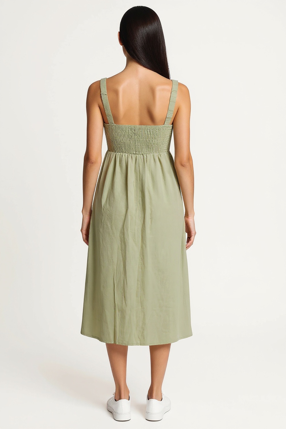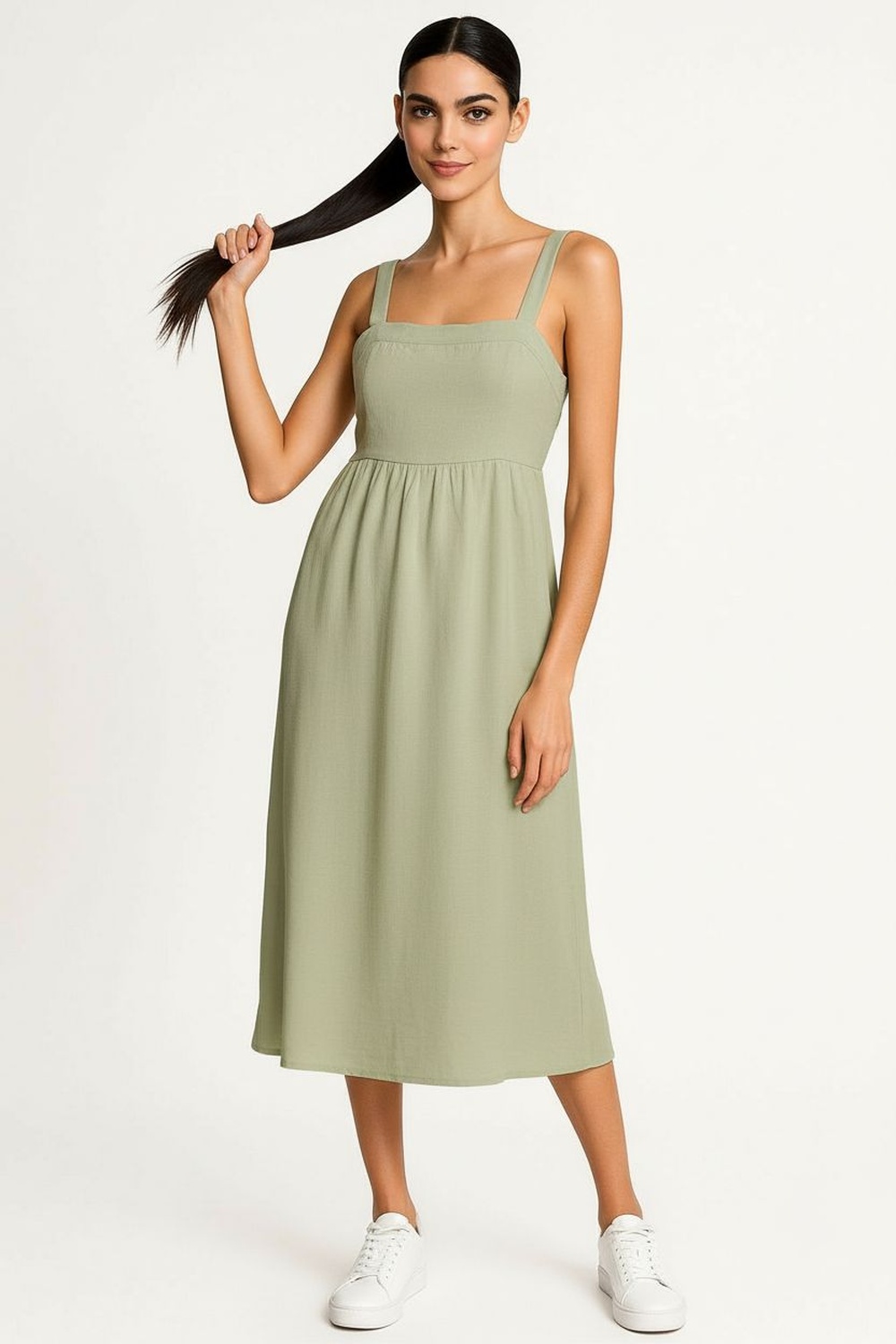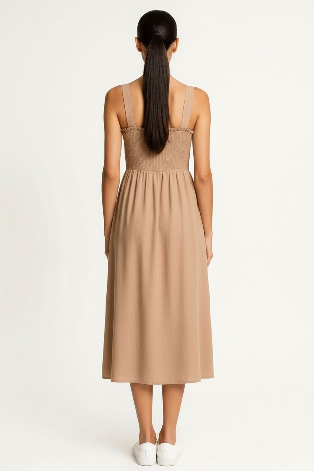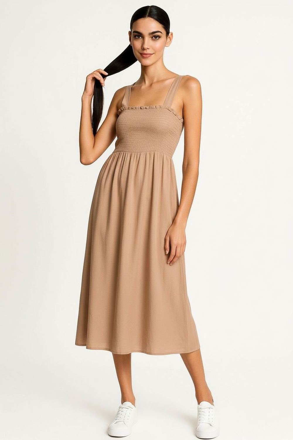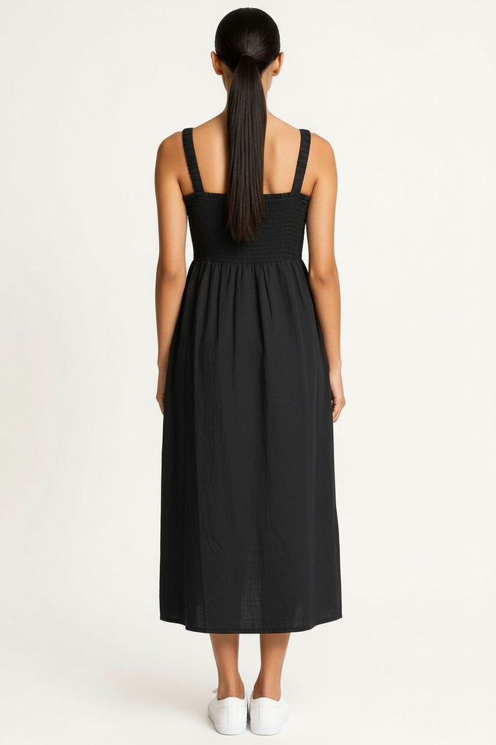 Maxi vestido de tirantes con escote recto ajuste superior tipo smock falda amplia con caída ligera confección fresca y cómoda de largo amplio