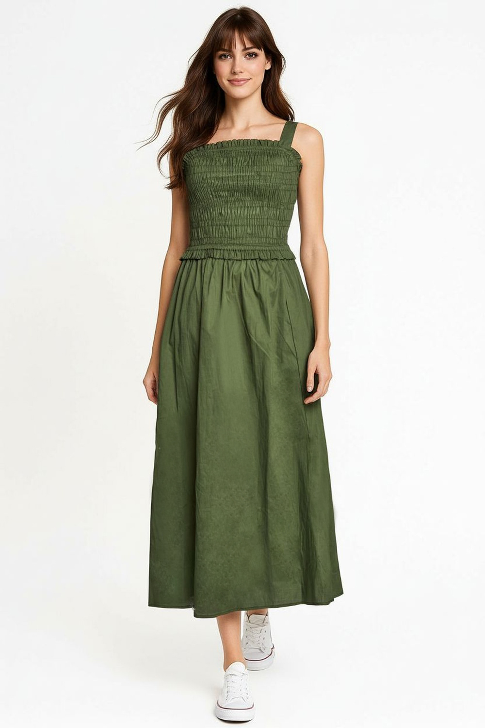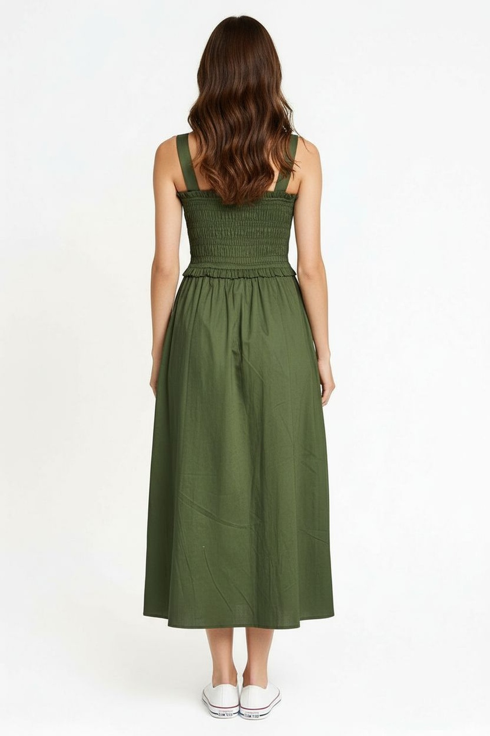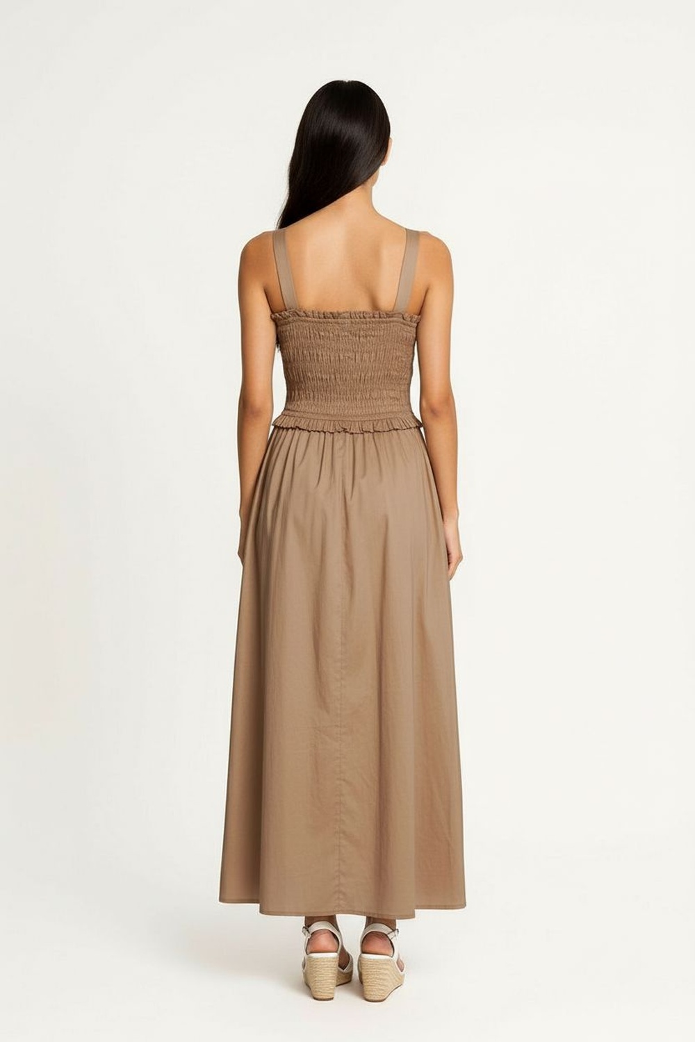 Maxivestido de tirantes anchos con parte superior tipo smock que se adapta al cuerpo, corte amplio de largo midi con caída fluida que brinda comodidad al caminar, cintura definida con elástico que estiliza la figura, confección en popelina ligera que aporta frescura y estructura