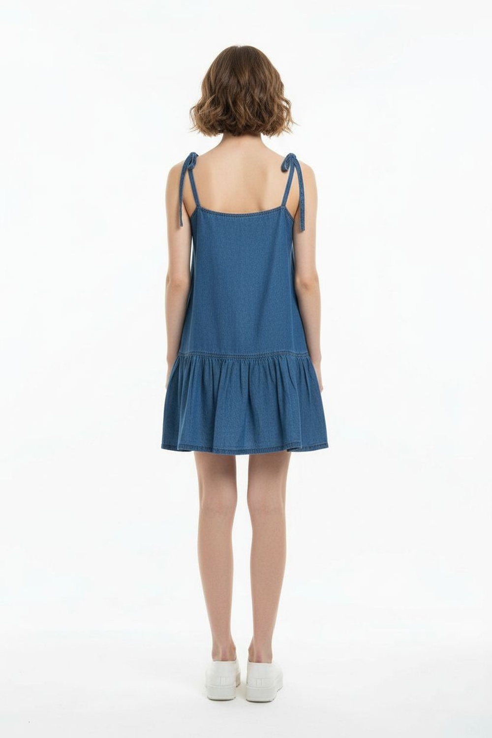 Vestido de tirantes delgados, escote recto, silueta suelta, detalle de olan en parte inferior, estructura ligera, confección fluida para mayor comodidad