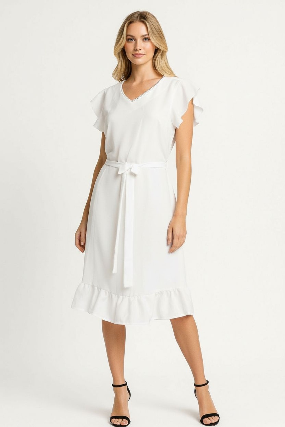 Vestido corto con cuello redondo y escarola suave integrada, manga corta con volumen sutil y terminación ondulada, silueta recta con caída ligera, abertura frontal con jareta decorativa, confección en tejido plano con textura uniforme