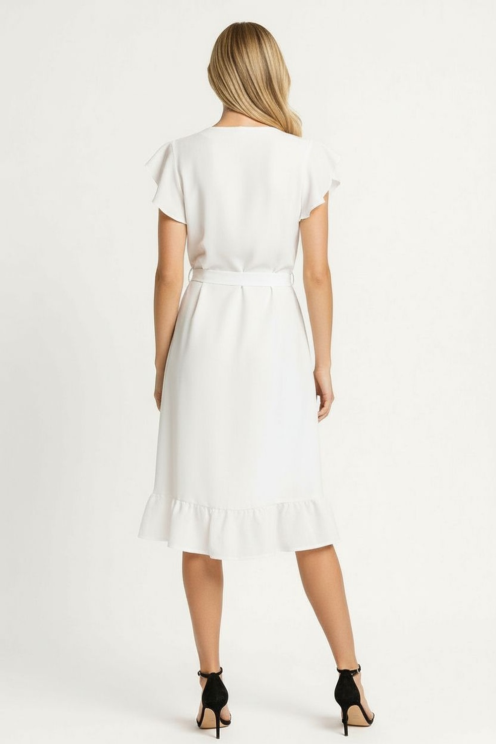 Vestido midi con manga corta y escote redondo de acabado limpio, silueta semi ajustada con caída fluida que aporta movimiento, cinturón del mismo tejido para definir la cintura y ajustar al gusto, largo debajo de la rodilla que brinda cobertura y elegancia, confección ligera de tacto suave que permite comodidad durante todo el día