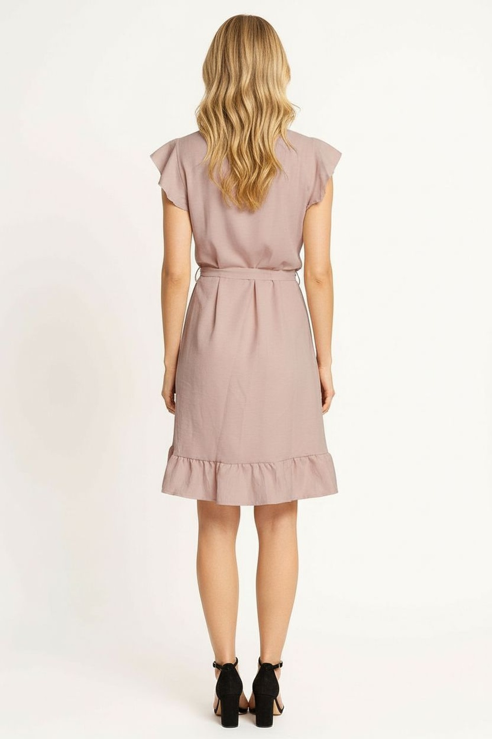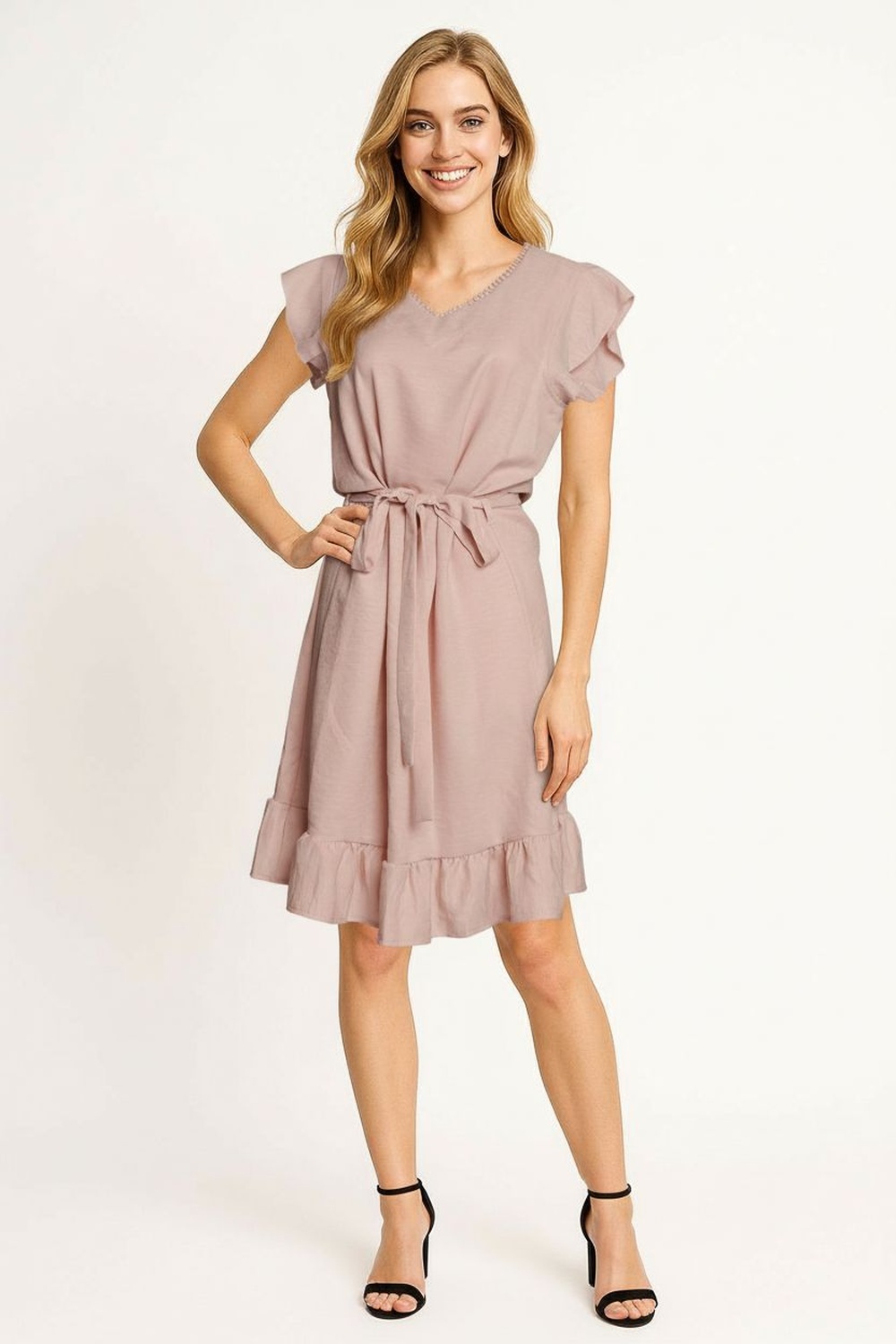 Vestido corto con escote en pico, manga corta con volumen, ajuste en cintura con lazo, falda con ligero movimiento, acabado en orillas suaves, silueta recta