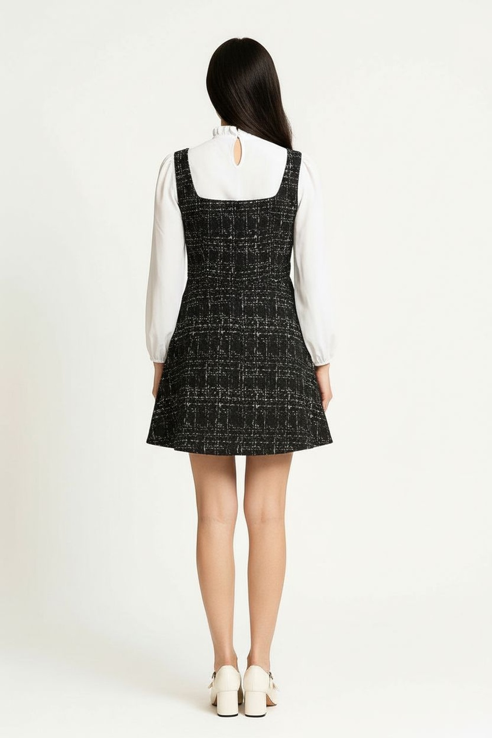 Vestido corto que simula doble prenda con blusa integrada de cuello alto y lazo decorativo, falda con tirantes anchos y estructura ajustada que define la cintura, confección en tela texturizada que aporta cuerpo y movimiento, mangas largas con puño elástico que ofrecen comodidad y estilo delicado, cierre trasero discreto que facilita su ajuste