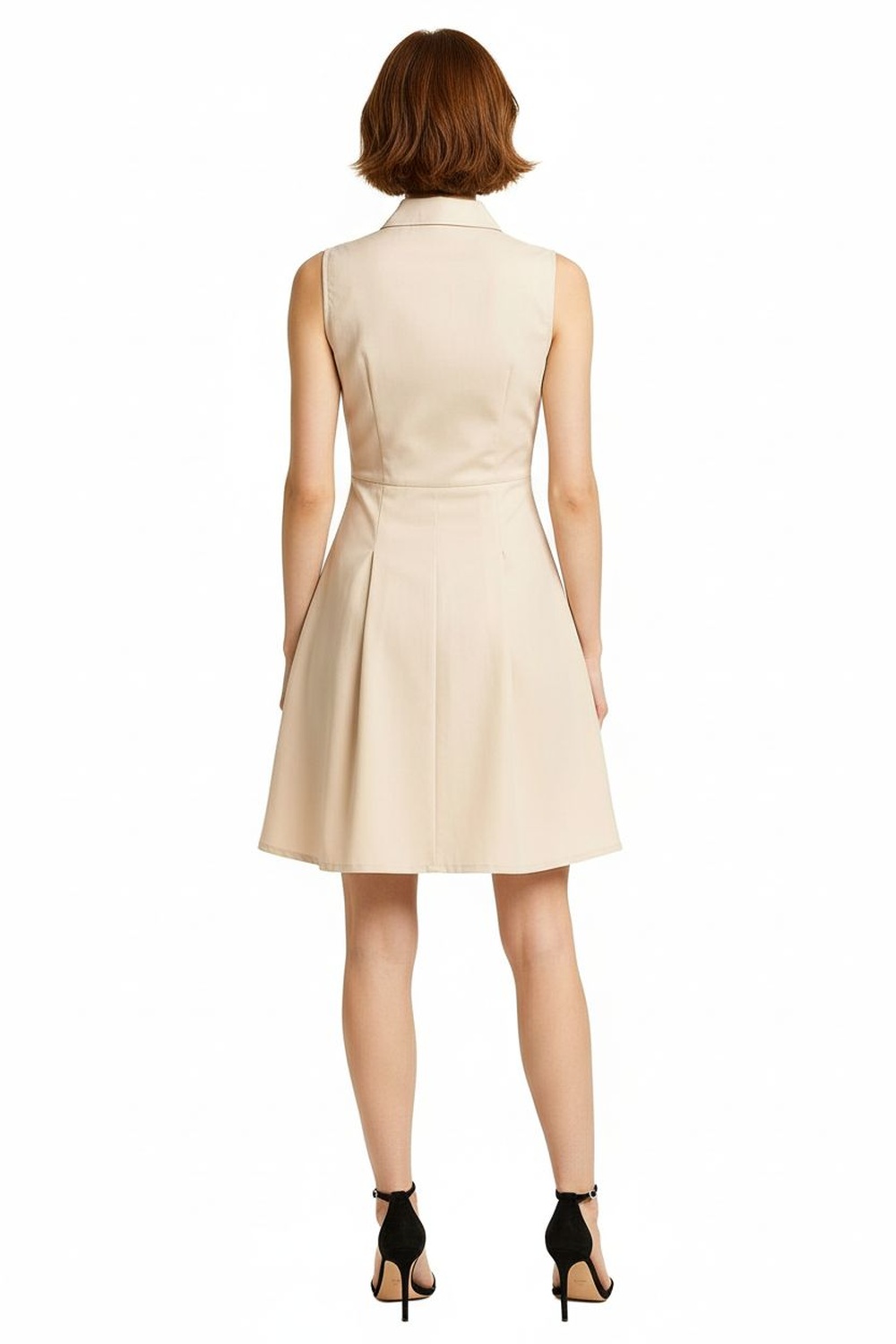 Vestido corto con botonadura frontal cuello camisero estructura definida y cortes que estilizan silueta largo arriba de rodilla