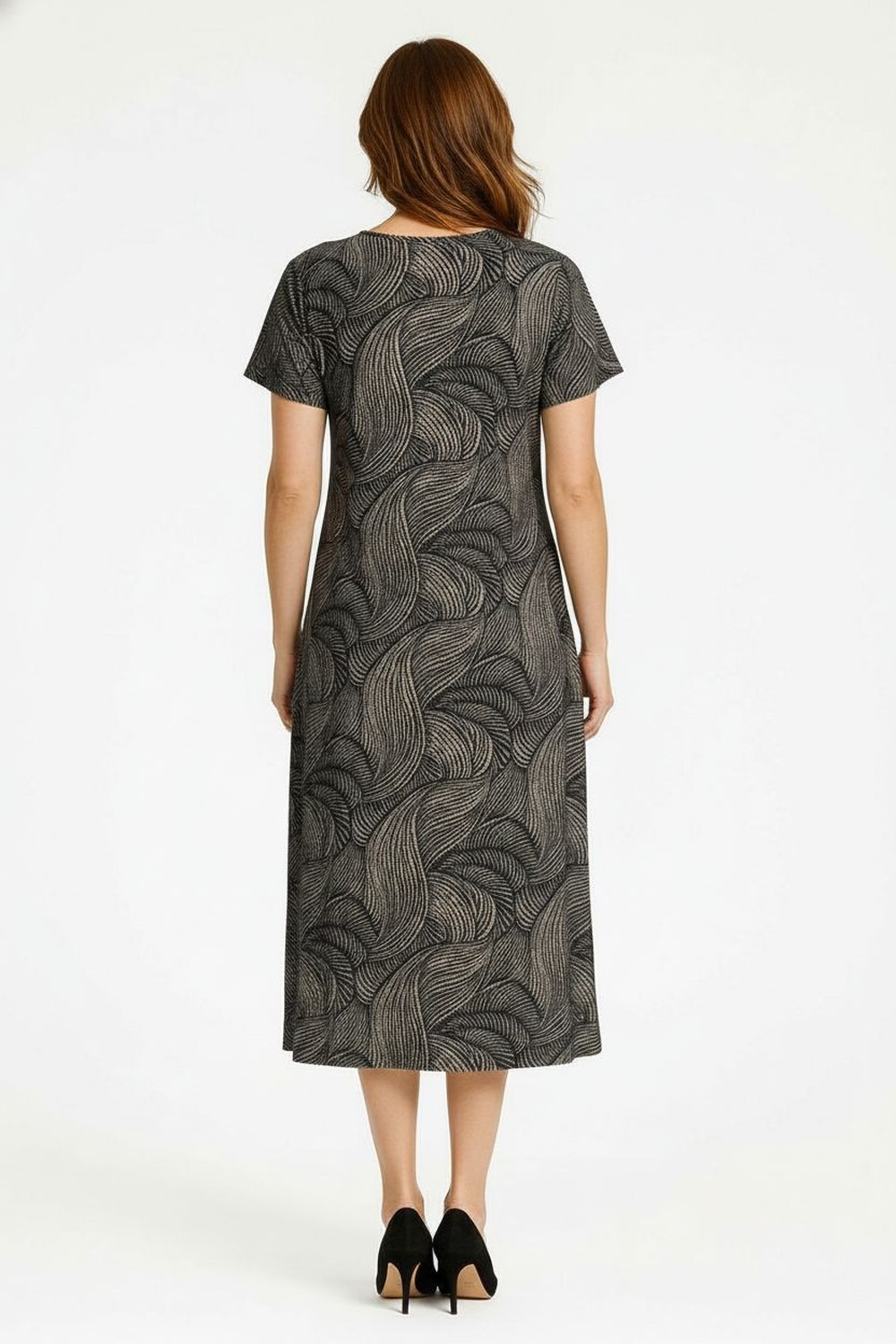 Vestido corte recto con manga tres cuartos que brinda comodidad y frescura, escote redondo que aporta versatilidad, silueta amplia que favorece la libertad de movimiento y distintos tipos de cuerpo, largo a la rodilla ideal para outfits casuales o semi formales, confección en tela ligera que asegura confort durante todo el día