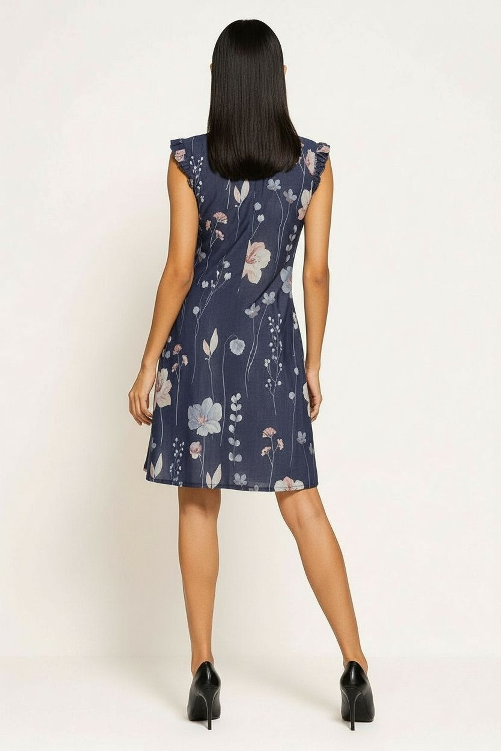 Vestido de corte suelto con escote recto y tirantes anchos que aportan soporte, manga corta con aplicación de olanes que añade volumen, largo arriba de la rodilla que brinda comodidad, confección en tejido ligero con caída natural
