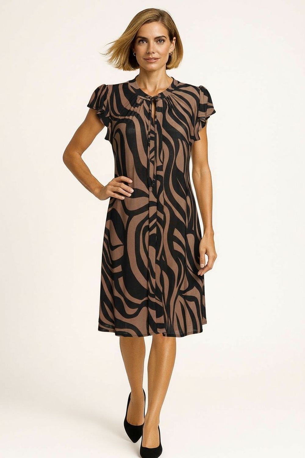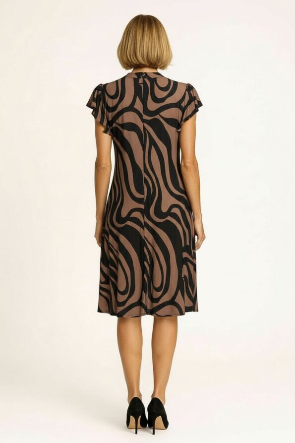 Un guiño elegante al chic parisino, este vestido corto destaca por su fino estampado de líneas verticales que estiliza la silueta, mientras que el cuello redondo con lazo de cinta negra añade un aire romántico y femenino, complementado con delicadas mangas de volante que aportan movimiento y sofisticación sin esfuerzo