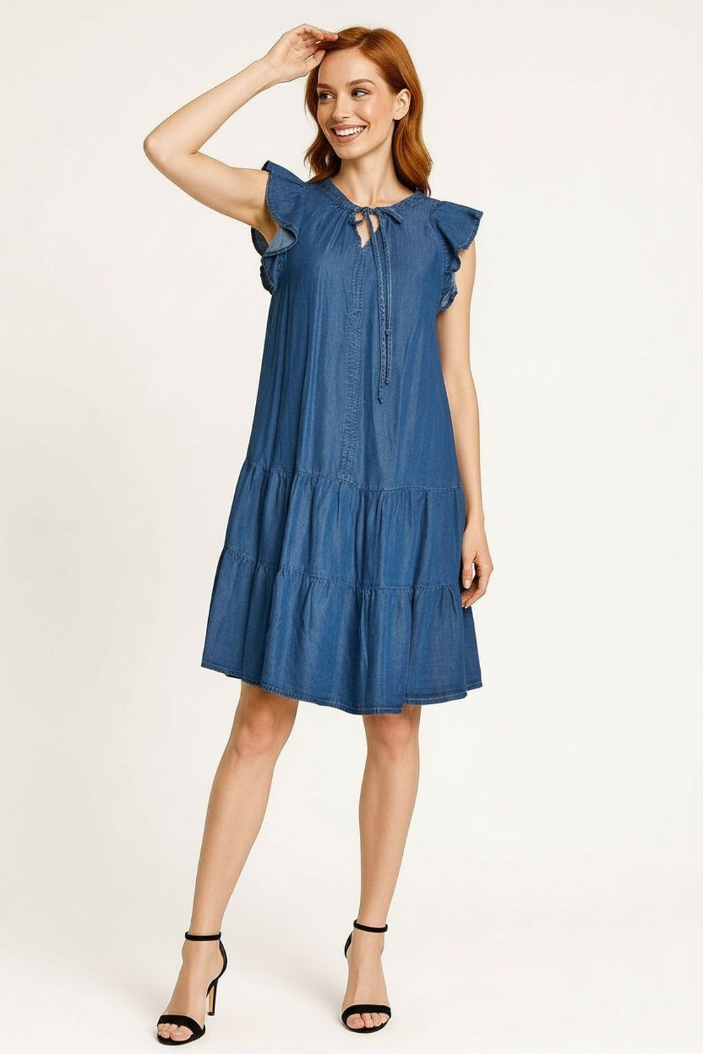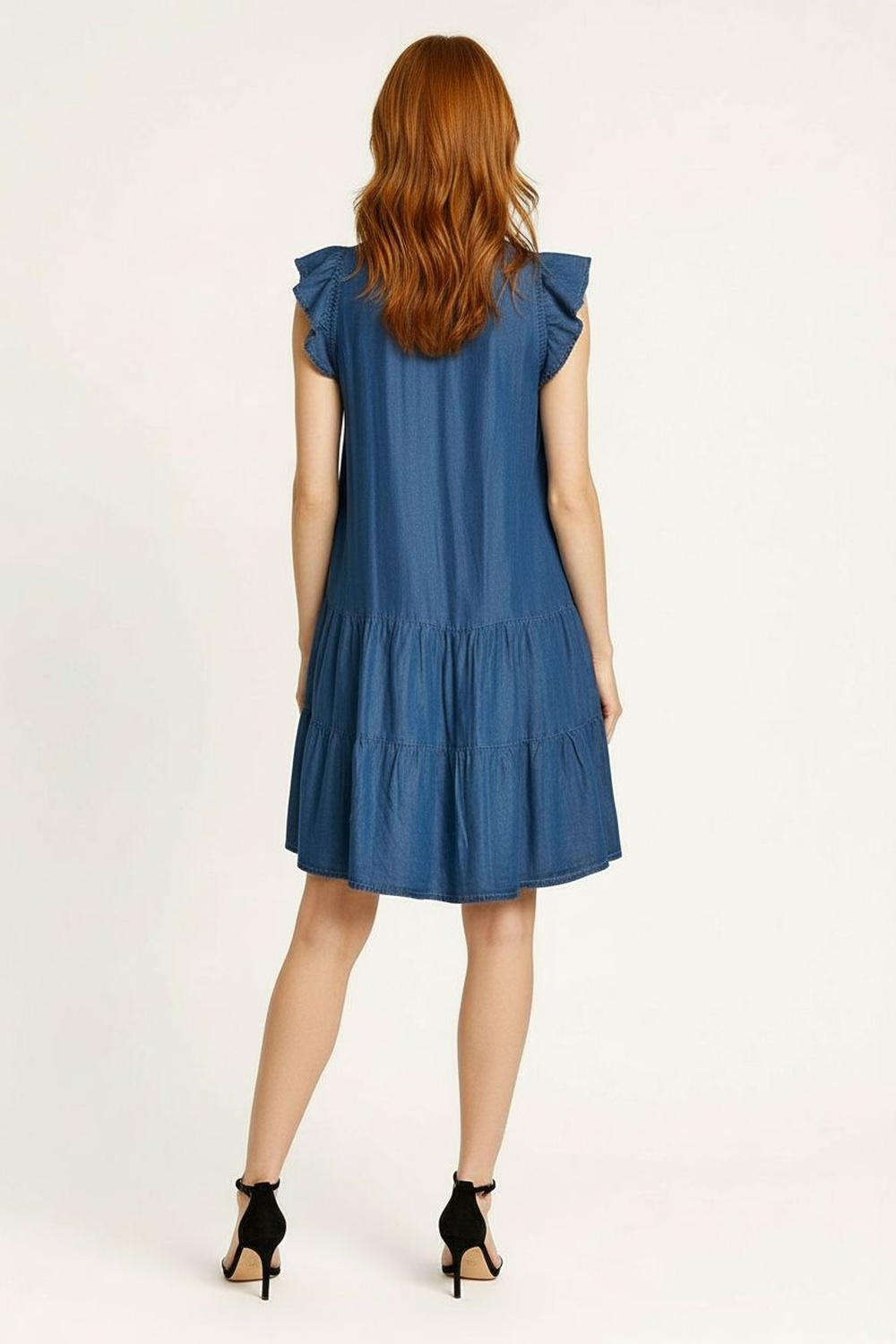 Vestido con escote en V con amarre, manga corta con olan, corte en niveles, caída amplia, largo a la rodilla, confección ligera