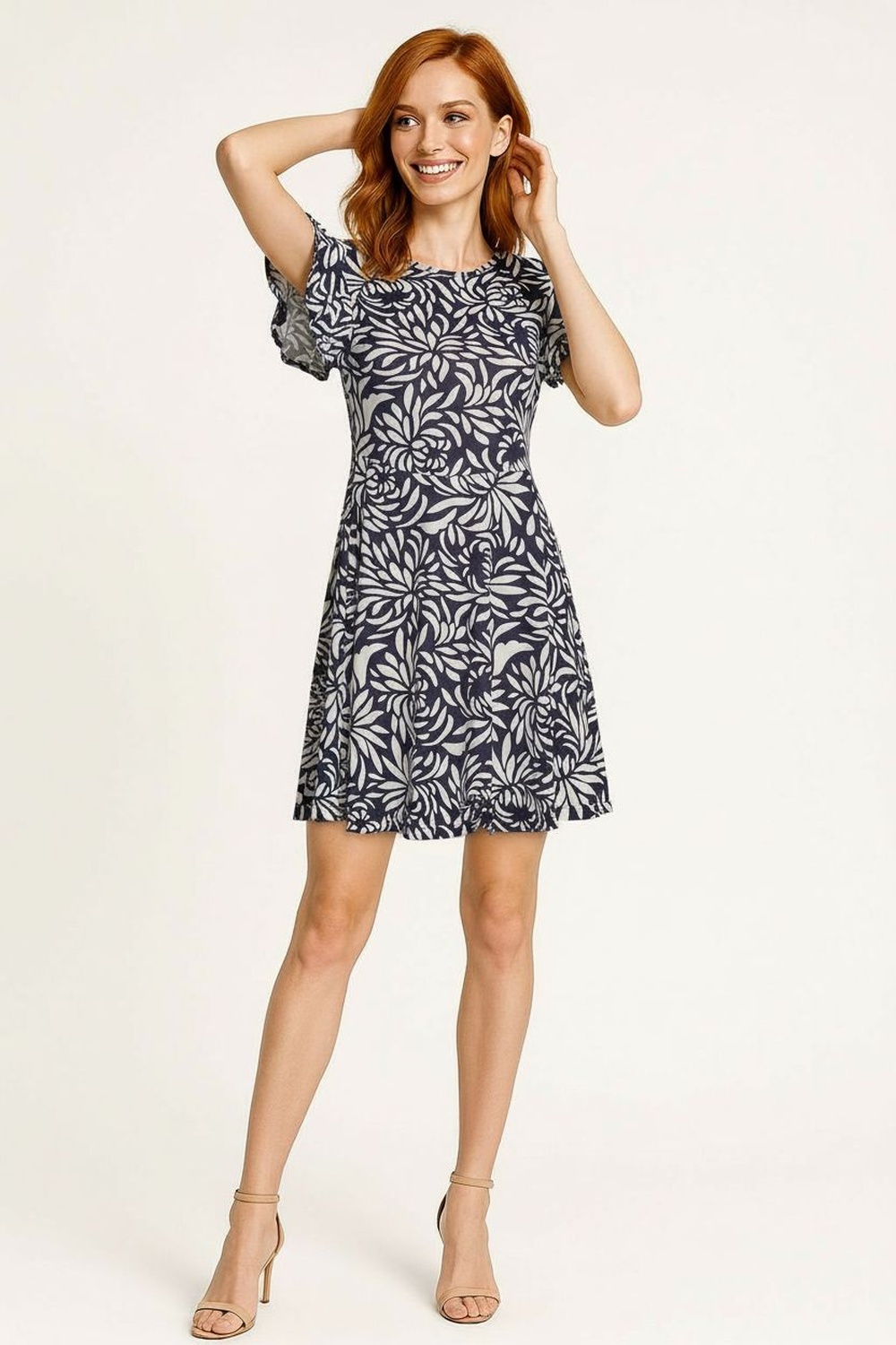 Vestido con escote redondeado, manga corta, ajuste superior tipo smock, corte a media pierna con caída fluida, confección ligera de tacto suave