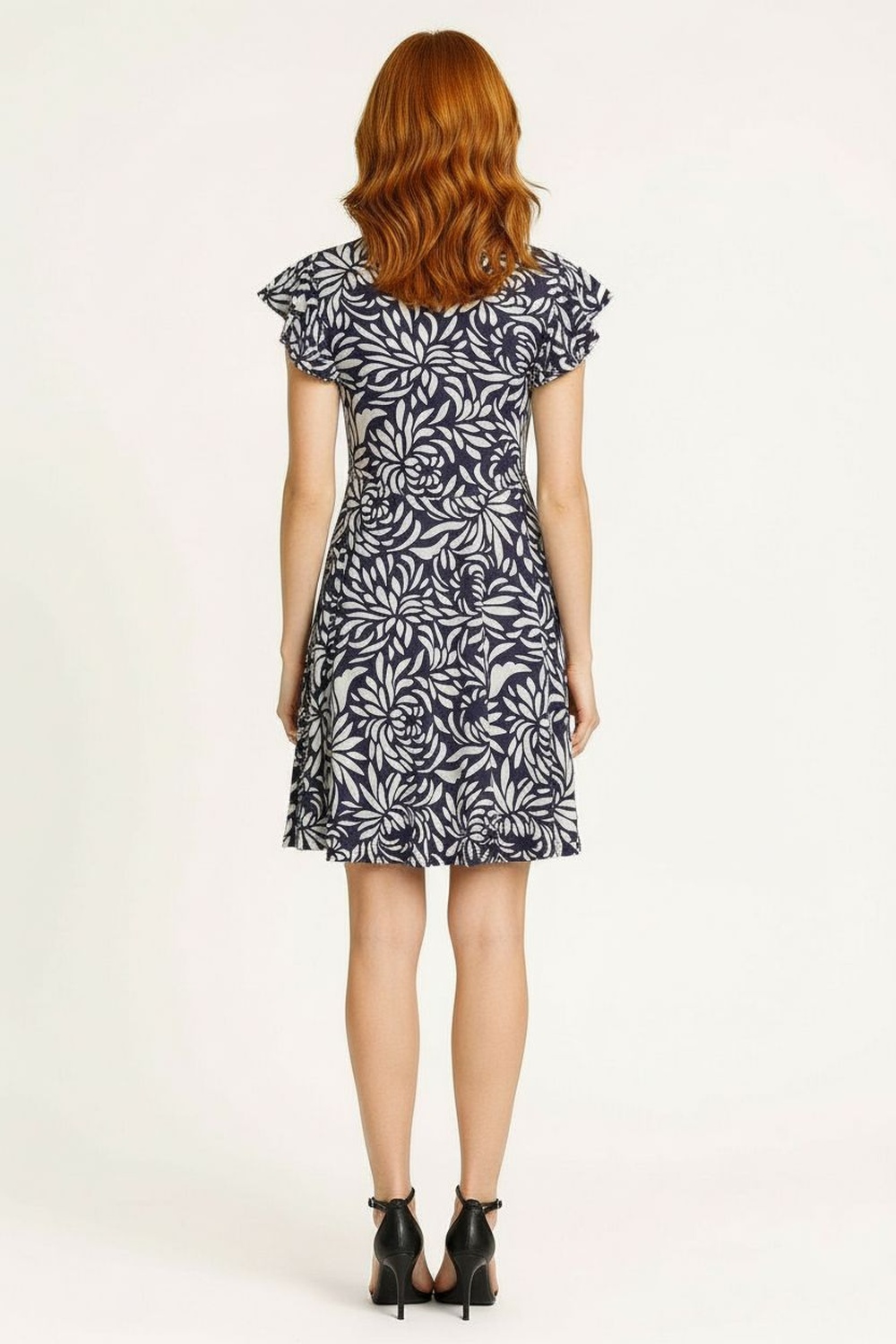 Vestido corto con manga corta, cuello cerrado, detalle de olanes en hombros, caída ligera, corte recto, FIT REGULAR