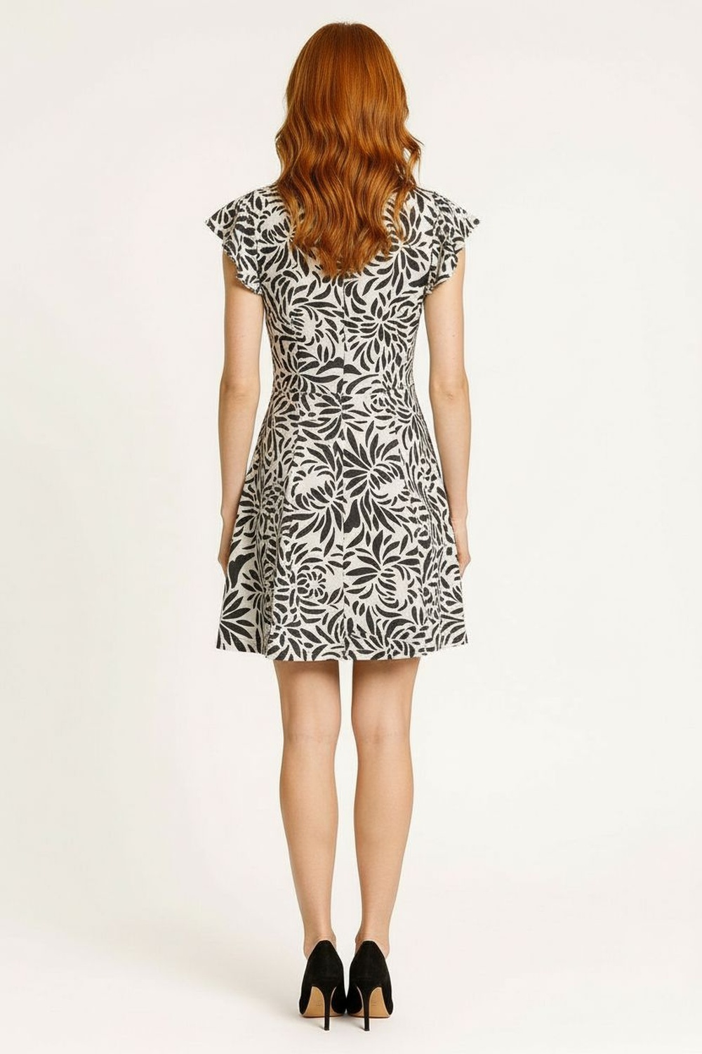 Vestido corto con cuello redondo y escarola suave integrada, manga corta con volumen sutil y terminación ondulada, silueta recta con caída ligera, abertura frontal con jareta decorativa, confección en tejido plano con textura uniforme