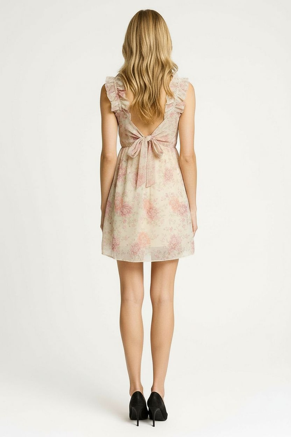 Vestido corto con tirantes anchos, escote cuadrado, ajuste en cintura con fruncido, falda con volumen ligero, espalda con abertura y lazo ajustable, caída suave, terminado limpio en orillas