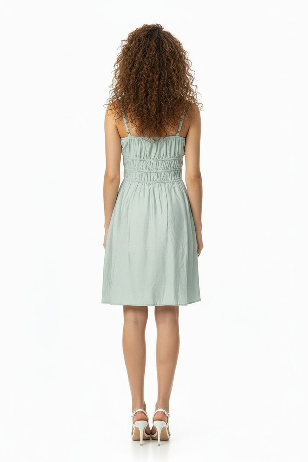Vestido corto con tirantes delgados, escote con amarre frontal, busto fruncido, cintura elástica, falda con caída amplia