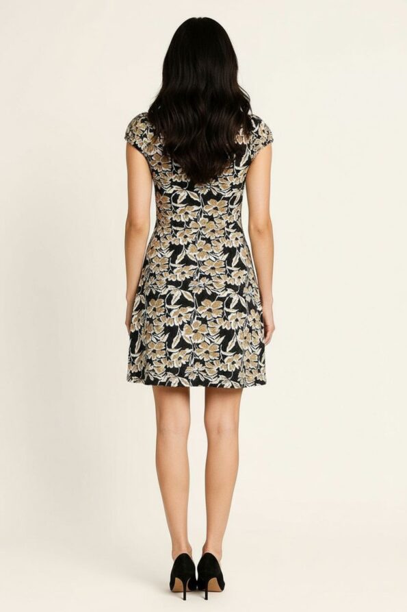 Vestido corto con escote redondo amplio que realza el cuello, mangas cortas con ajuste suave que aportan comodidad, silueta ceñida que resalta la figura, dobladillo curvo que añade un toque moderno, confeccionado en tejido elástico de tacto suave que brinda libertad de movimiento y ajuste perfecto