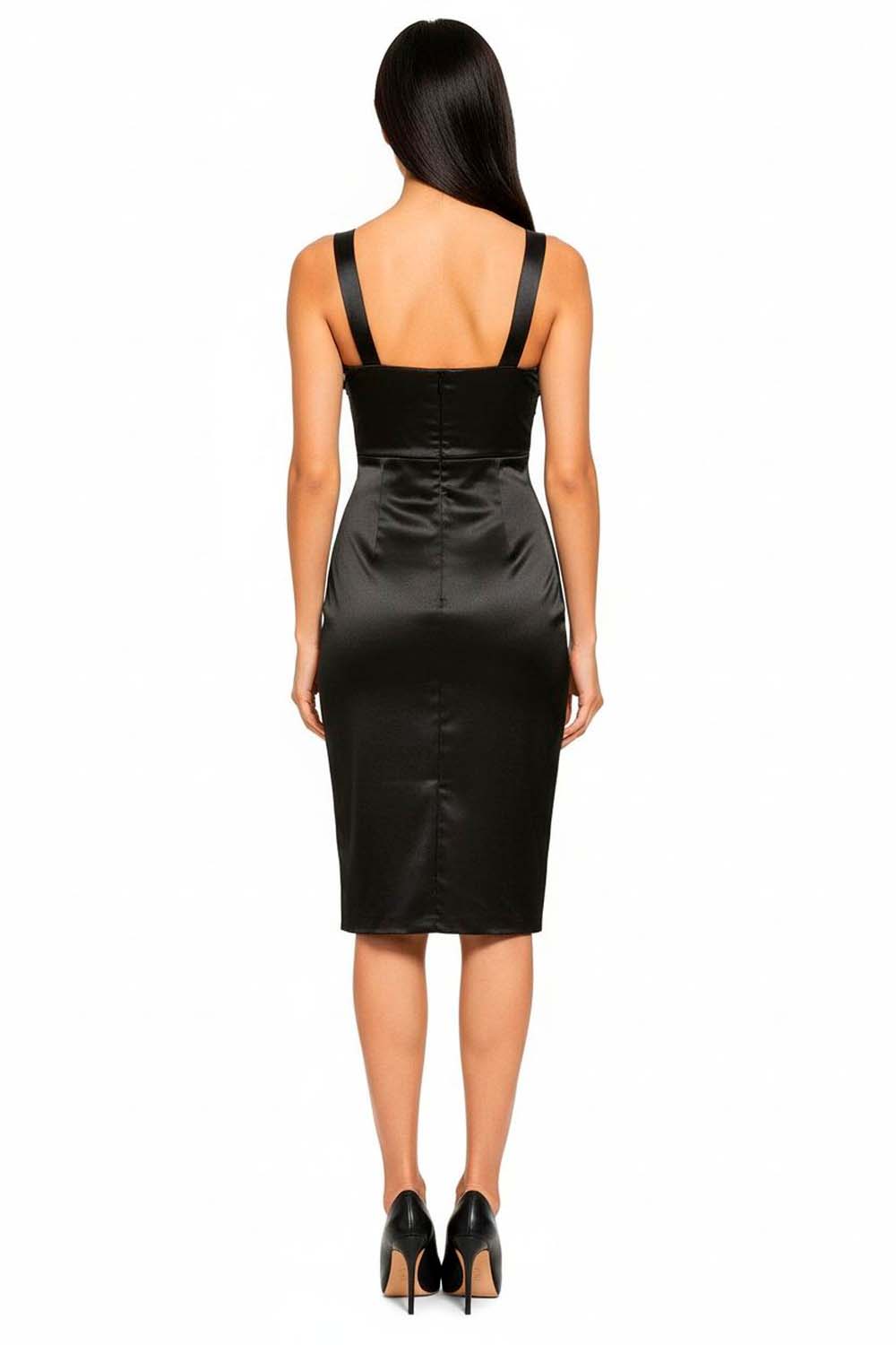Vestido largo confeccionado en tejido elástico con acabado brillante, escote drapeado con tiras delgadas que aportan un toque sofisticado, diseño ajustado que realza la silueta, abertura lateral que otorga movimiento y estilo elegante, espalda descubierta con caída fluida que aporta distinción en cada paso