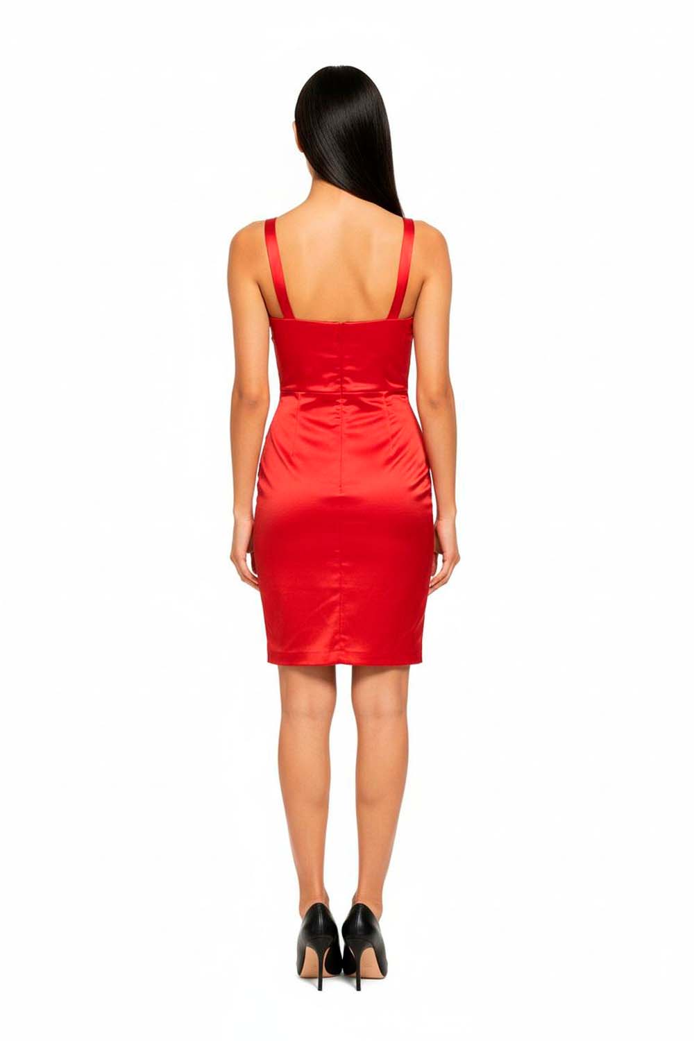 Vestido corto con tirante ancho y escote estructurado que realza la parte superior, diseño entallado con drapeado lateral que define la silueta, falda con cruce frontal que aporta dinamismo en el bajo, confección en tela satinada de acabado brillante que brinda presencia elegante en eventos especiales