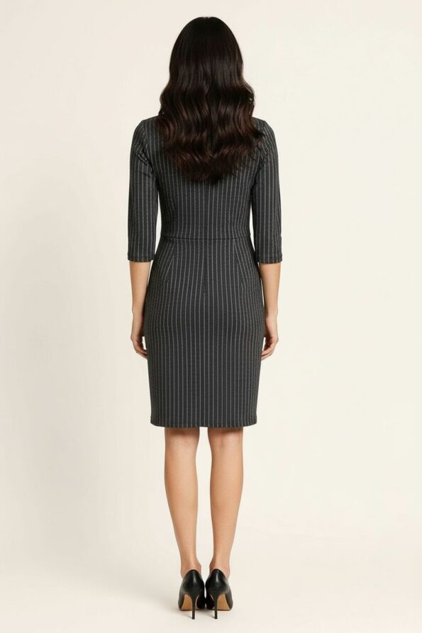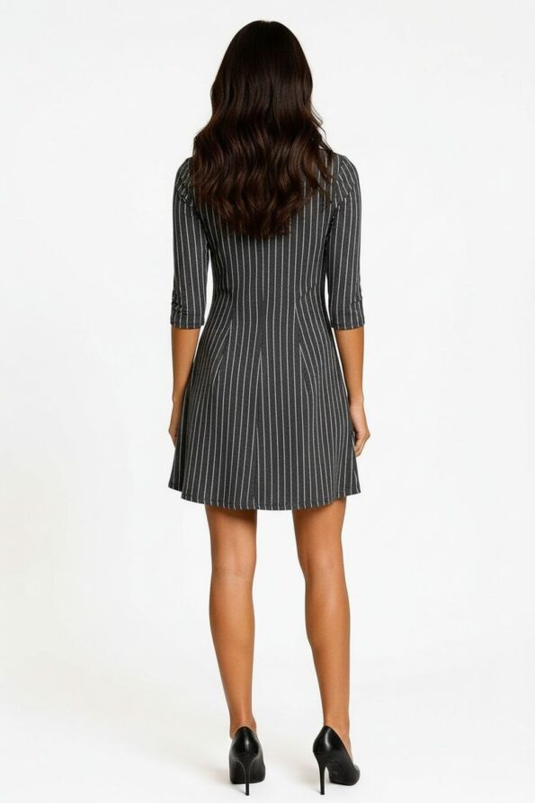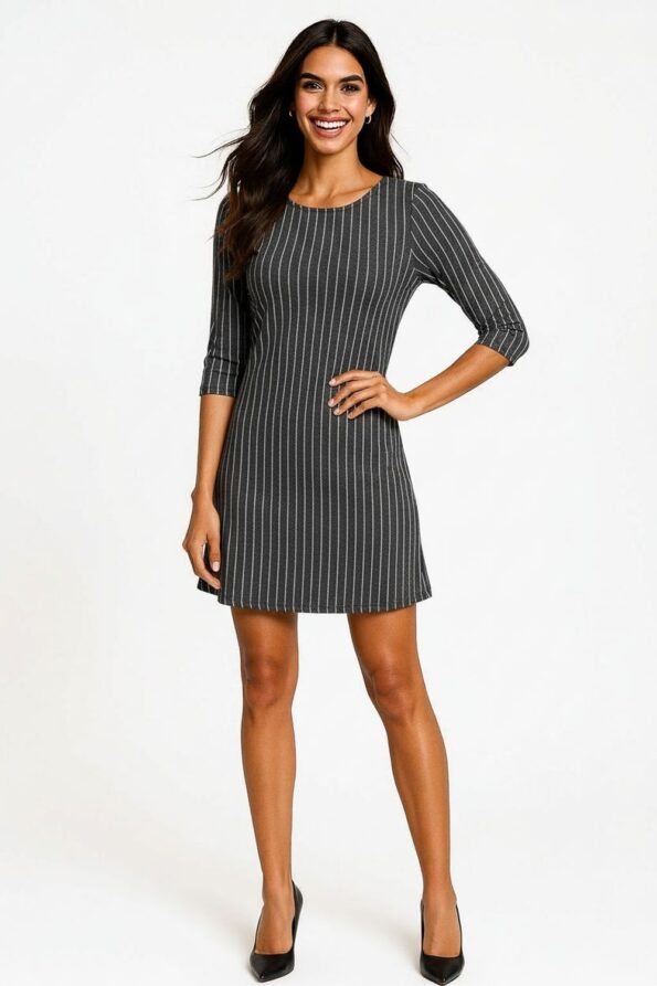 Vestido corto con cuello redondo y manga media que aporta equilibrio y comodidad, confección con estructura ligera que permite movilidad, corte recto que realza la silueta sin ajustar, detalle de líneas verticales que estilizan y aportan un toque moderno, acabado suave que conserva su forma y textura tras cada uso