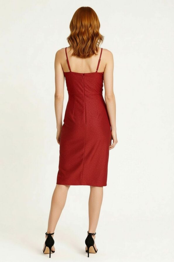 Vestido corto con tirantes delgados y escote recto que realza el pecho, drapeado lateral que estiliza la figura y añade movimiento, abertura discreta al frente que aporta un toque moderno, confeccionado en tejido elástico con brillo sutil que brinda elegancia y comodidad