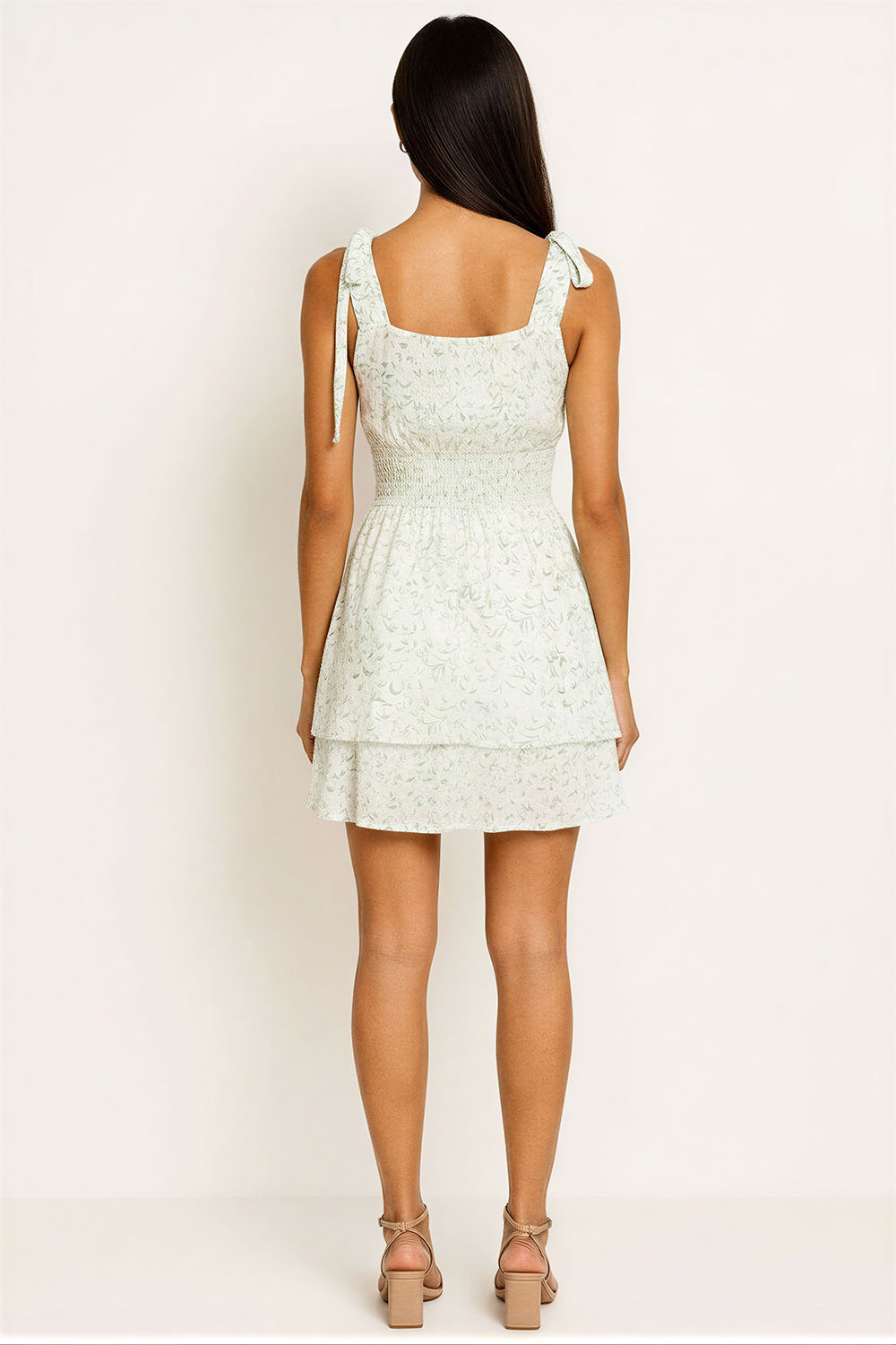 Vestido corto con tirantes ajustables que permiten mejor adaptación, corte a la cintura que define la figura, falda con caída en capas que aporta volumen y movimiento, confección en tela ligera con textura suave que brinda comodidad en uso prolongado