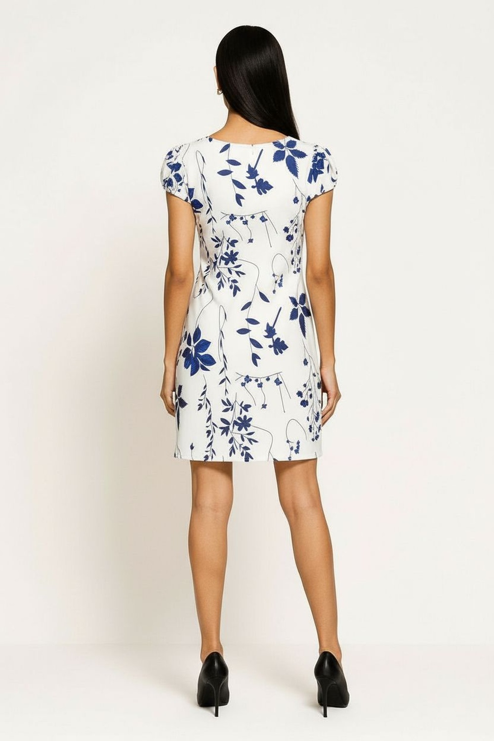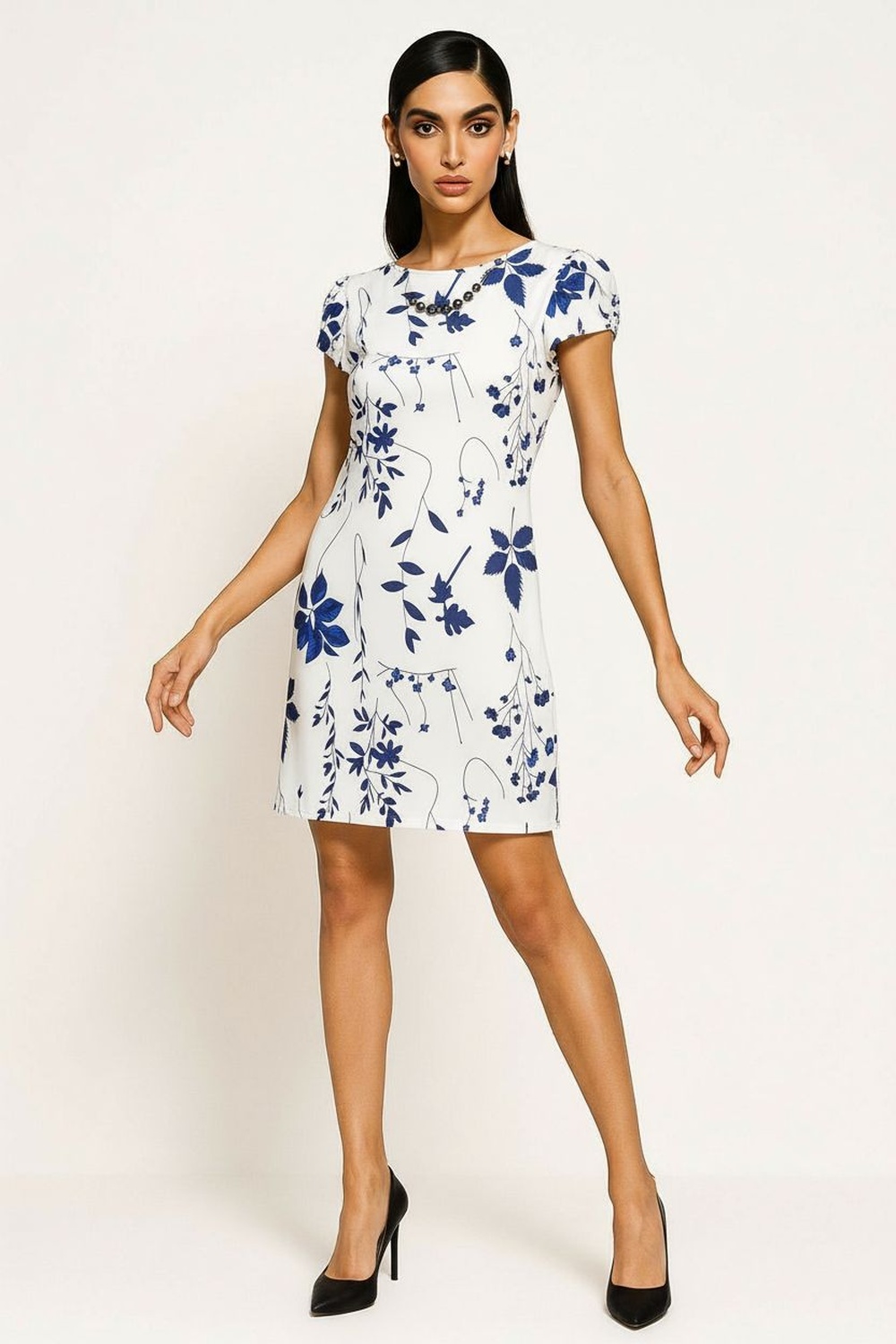 Vestido corto de manga corta con detalle de lazo al frente que aporta estructura y movimiento, escote en forma de pico que estiliza visualmente el cuello, corte recto ligeramente entallado que define la silueta, confección en tela ligera de tacto suave con diseño floral que brinda presencia femenina en cualquier ocasión