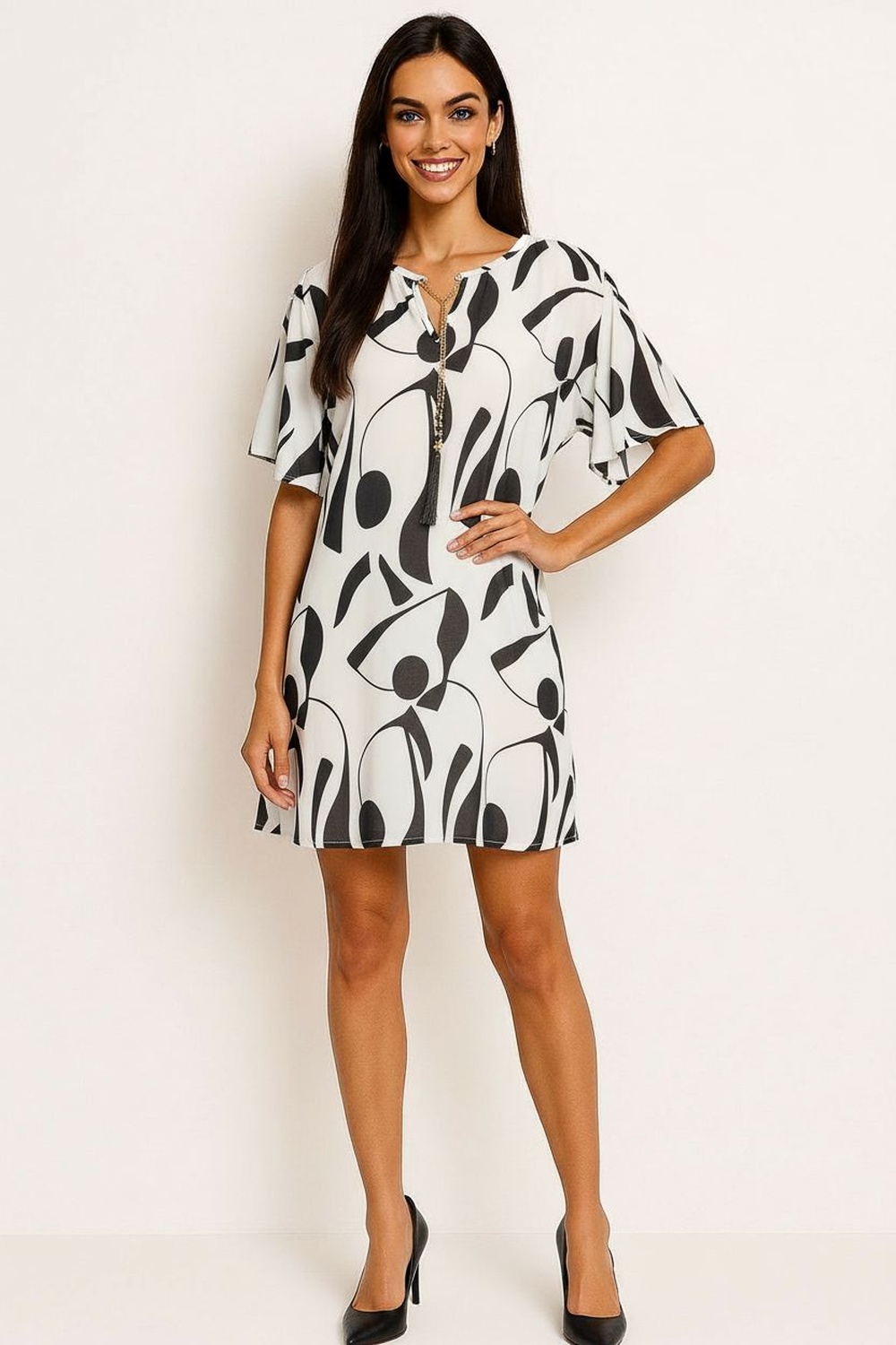 Vestido con escote redondo y abertura en forma de lágrima adornada con cadena dorada decorativa que aporta un toque sofisticado, mangas cortas con volantes en capas que añaden movimiento y estilo, silueta con caída ligera que ofrece comodidad y elegancia, confección en tela de tacto suave con acabado fluido que realza la figura con sutileza