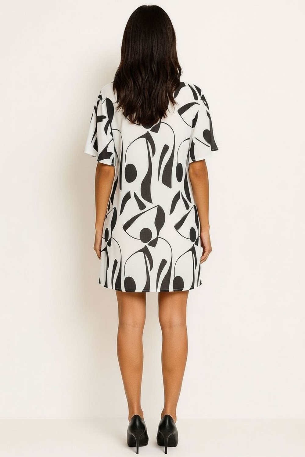 Vestido corto con cuello redondo y detalle de abertura en escote con aplicación metálica, mangas con volantes que añaden movimiento y feminidad, confección en tejido estructurado de tacto suave que conserva la forma, diseño limpio y elegante para cualquier ocasión