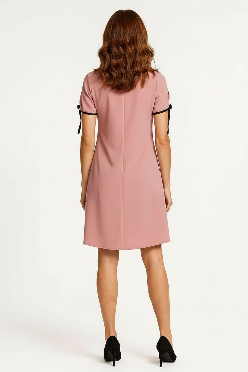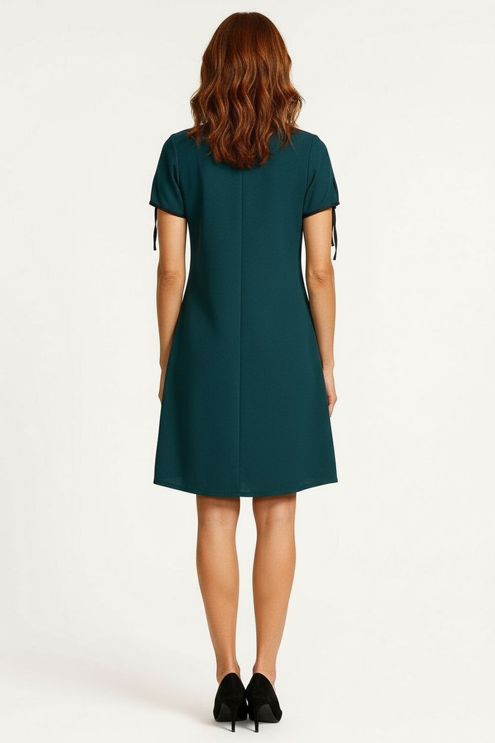 Vestido corto con escote redondo y abertura frontal discreta, manga corta con amarre lateral ajustable, corte recto que brinda comodidad, largo arriba de la rodilla con caída fluida, confección en tejido ligero con movimiento natural