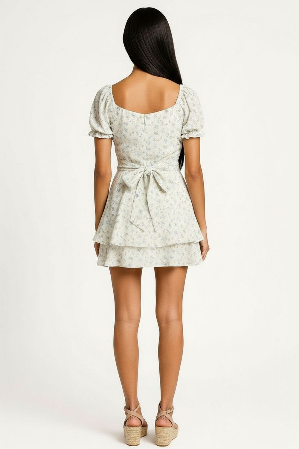 Vestido corto con escote amplio y manga globo de volumen ligero, corte en cintura con ajuste posterior mediante lazo que define la silueta, falda corta con caída suave y movimiento fluido, diseño con doble olan que aporta dimensión, confección ligera de tacto fresco