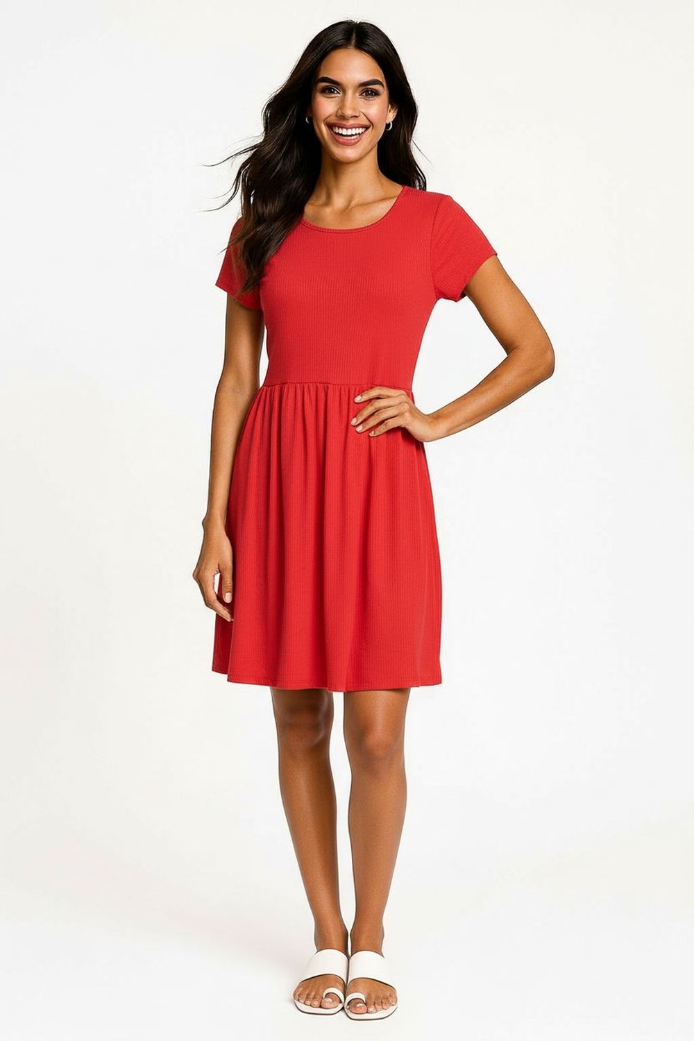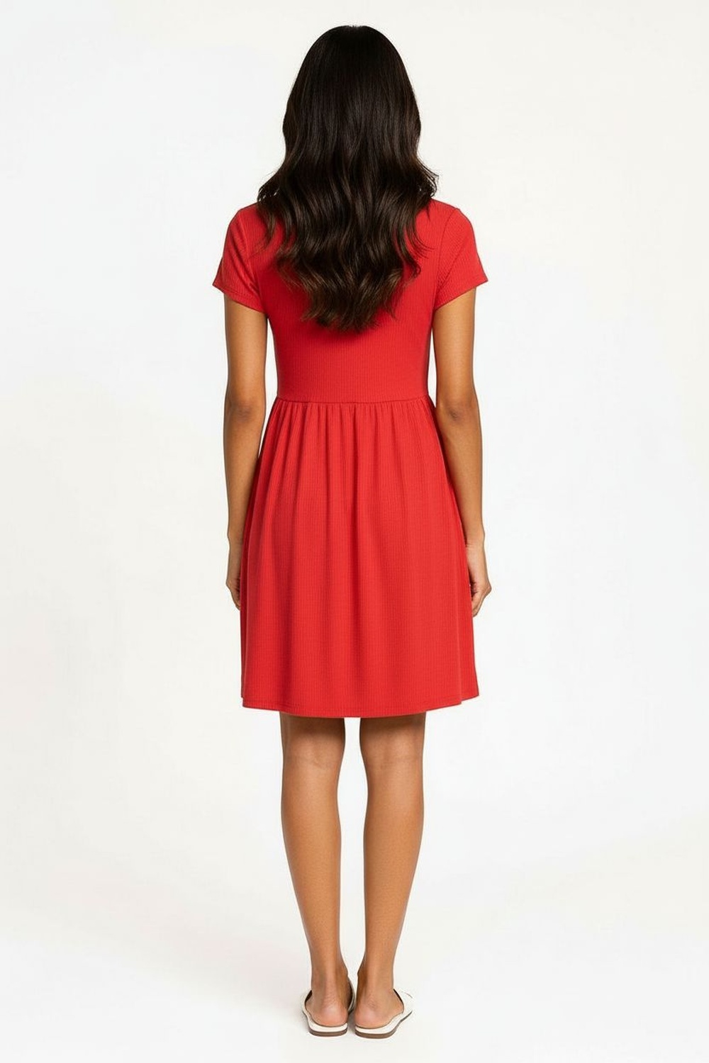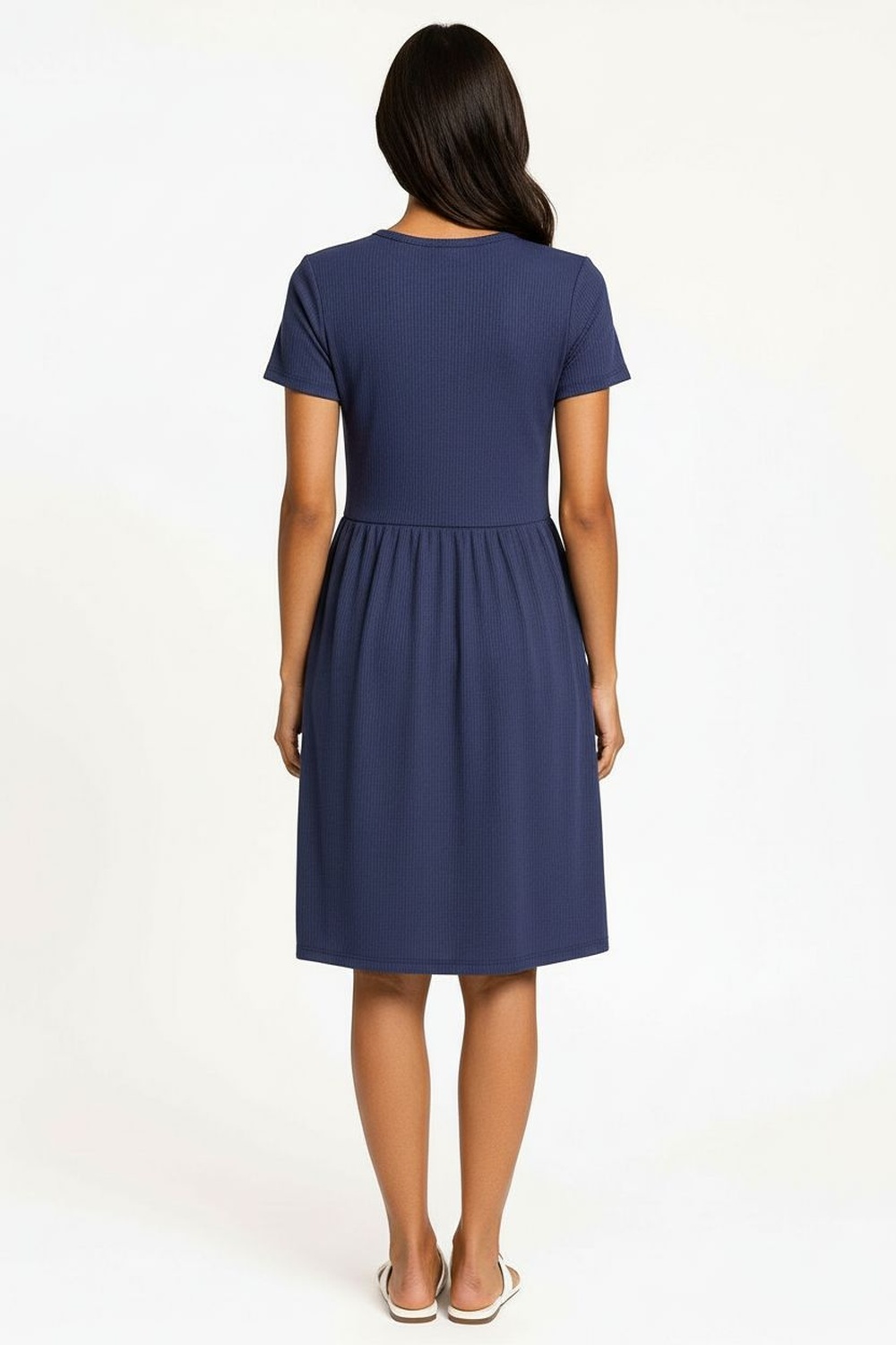 Vestido corto de manga corta con cuello redondo y cuerpo superior ajustado, confección en tejido acanalado que aporta elasticidad, corte en cintura con falda de caída suave, largo arriba de la rodilla que mantiene una silueta equilibrada