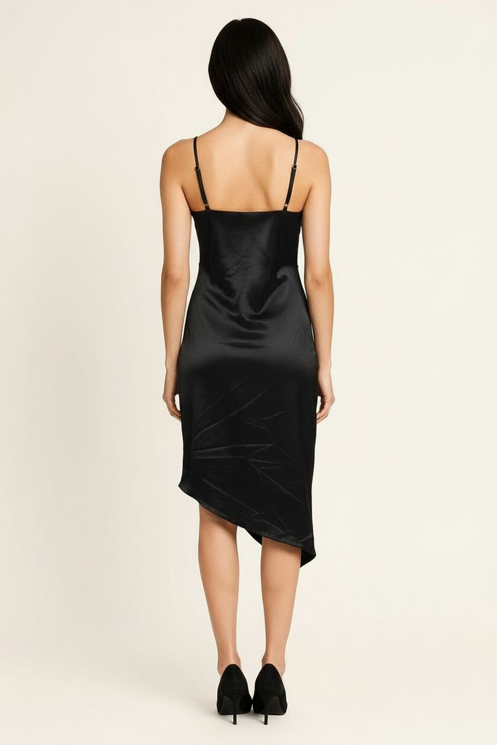 Vestido corto confeccionado en satín con caída fluida que realza la silueta, tirantes delgados ajustables y fruncido lateral que aporta un toque sofisticado, diseño entallado que ofrece un look moderno y atractivo para eventos especiales