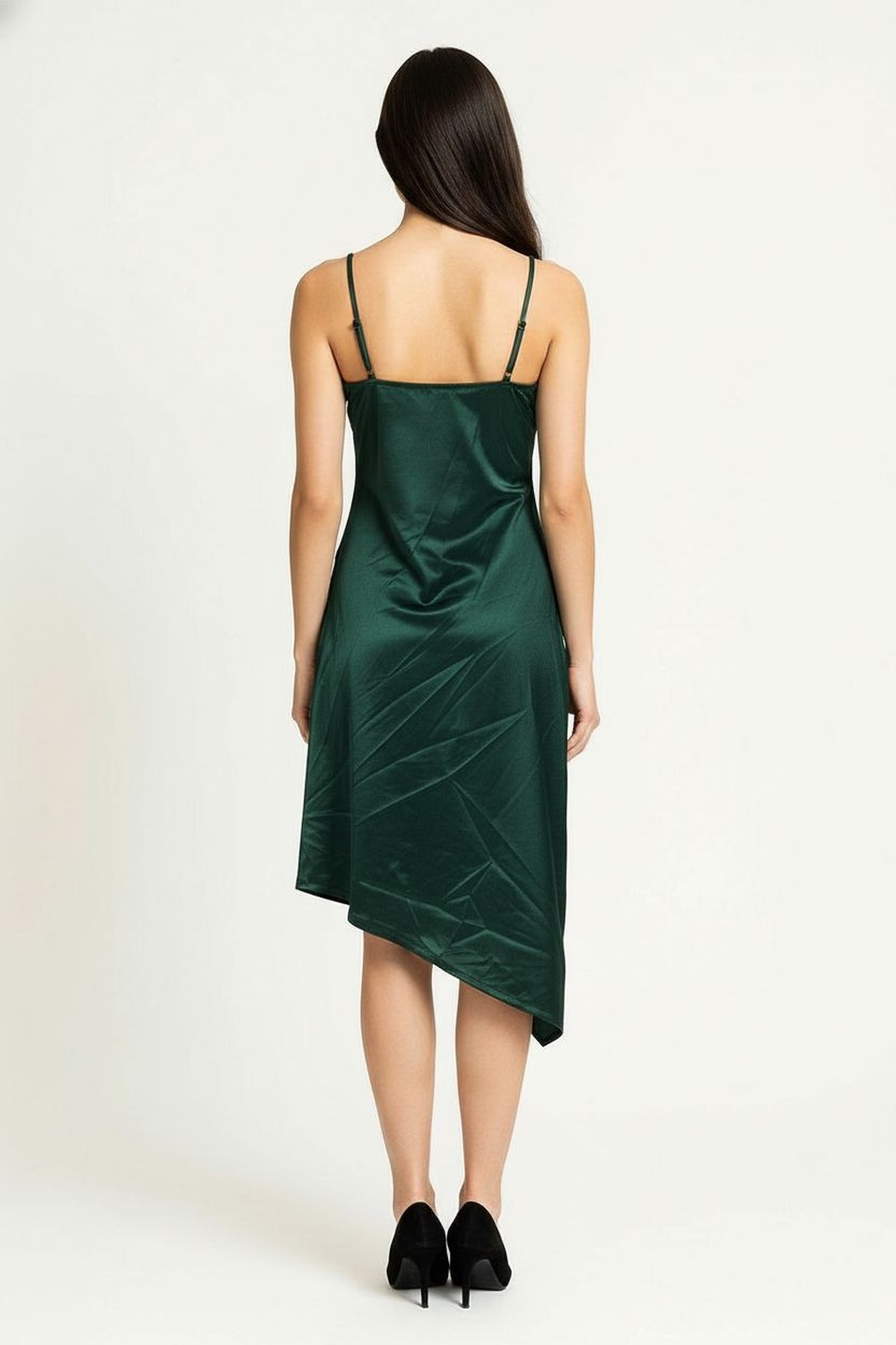Vestido largo con escote cruzado y tirantes finos, corte asimétrico con abertura lateral que aporta un toque sofisticado, frunce lateral que realza la silueta y caída fluida con textura brillante que resalta en cada movimiento