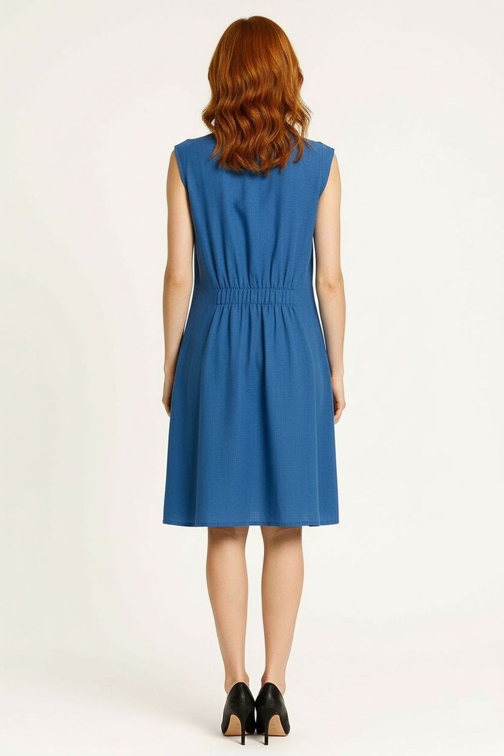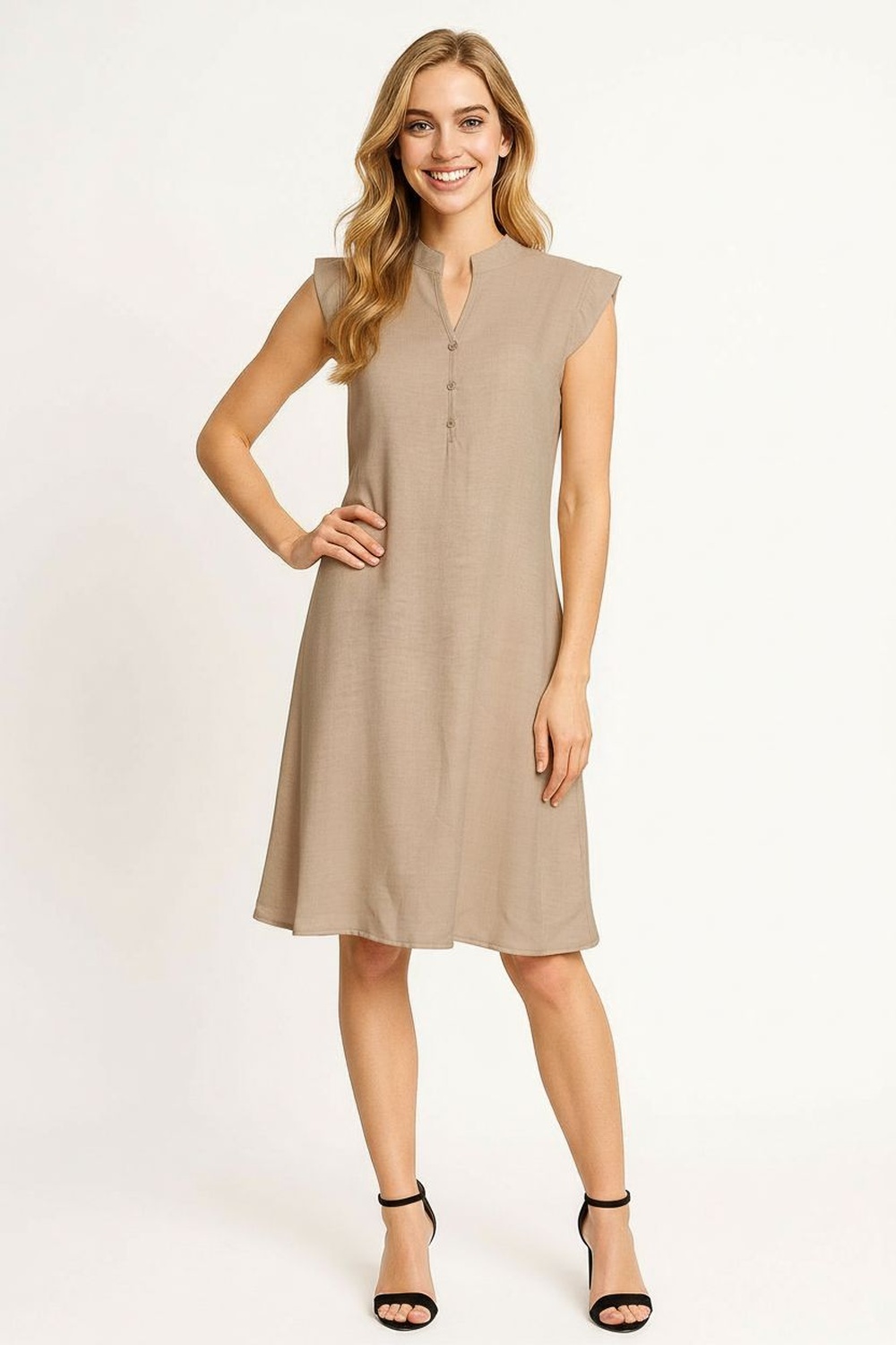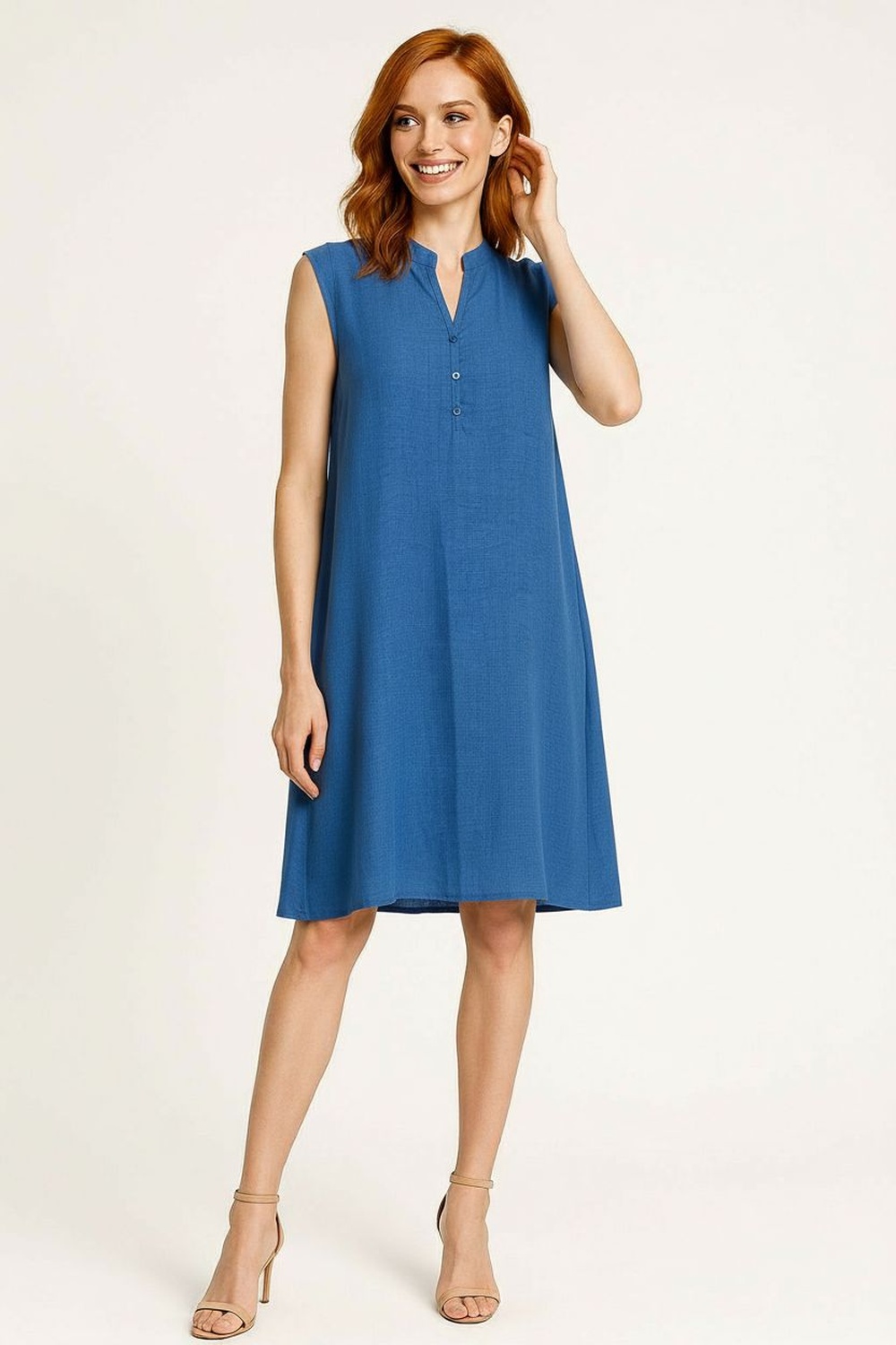 Vestido corto sin mangas, cuello con abertura y botones, corte recto, caída ligera, terminado limpio, FIT REGULAR