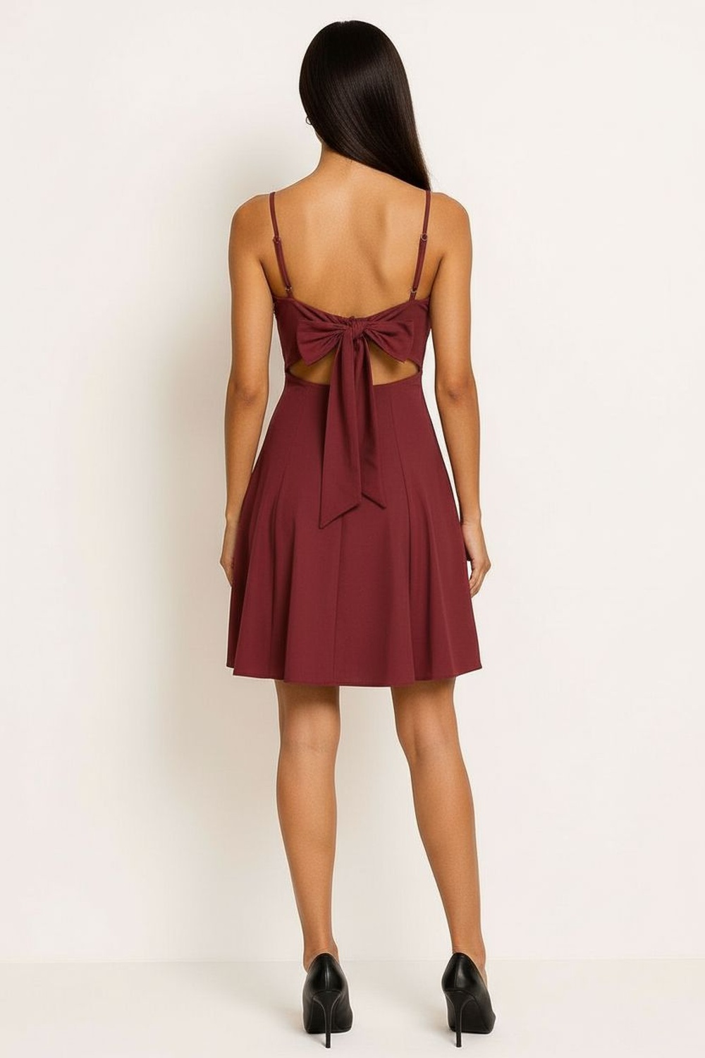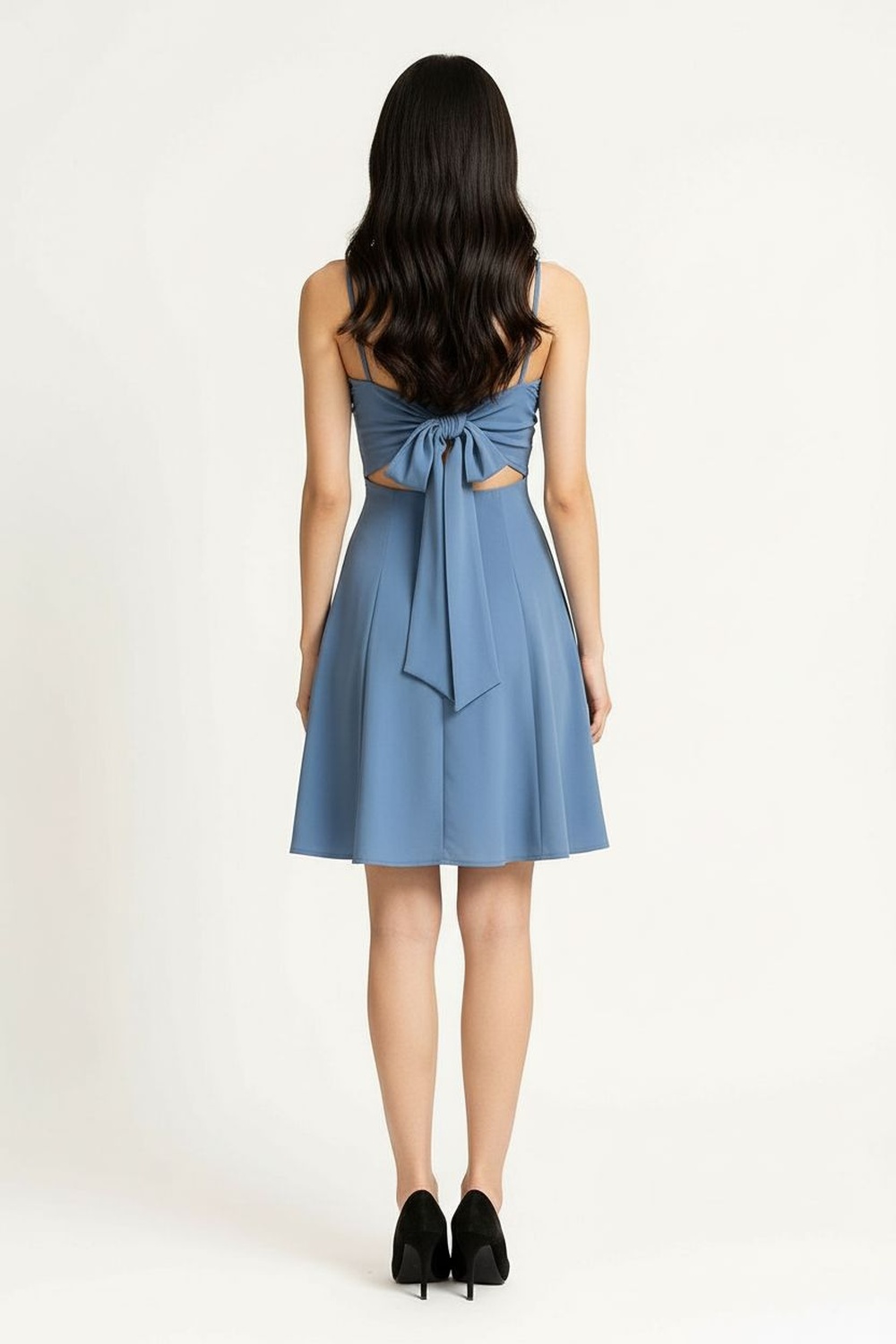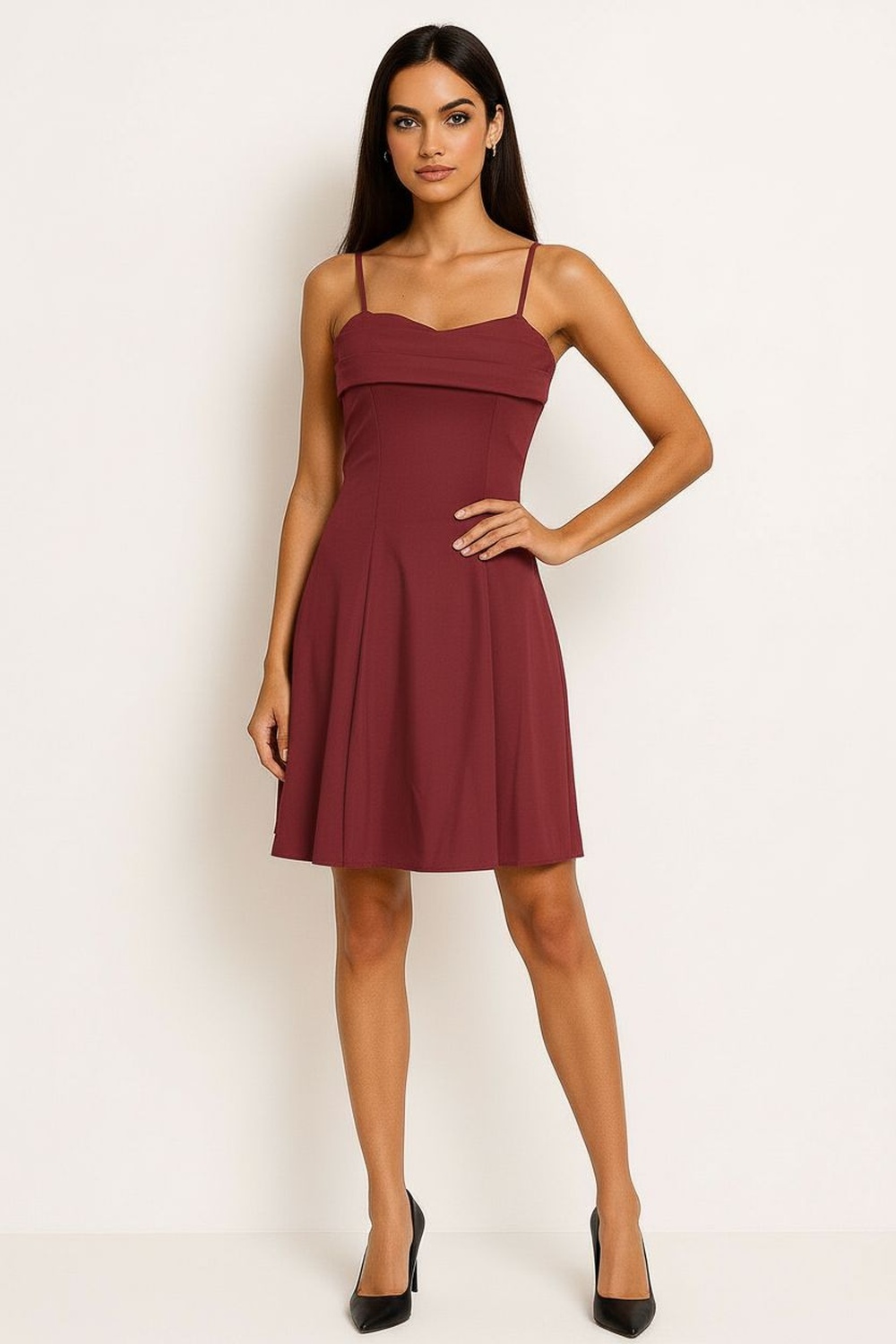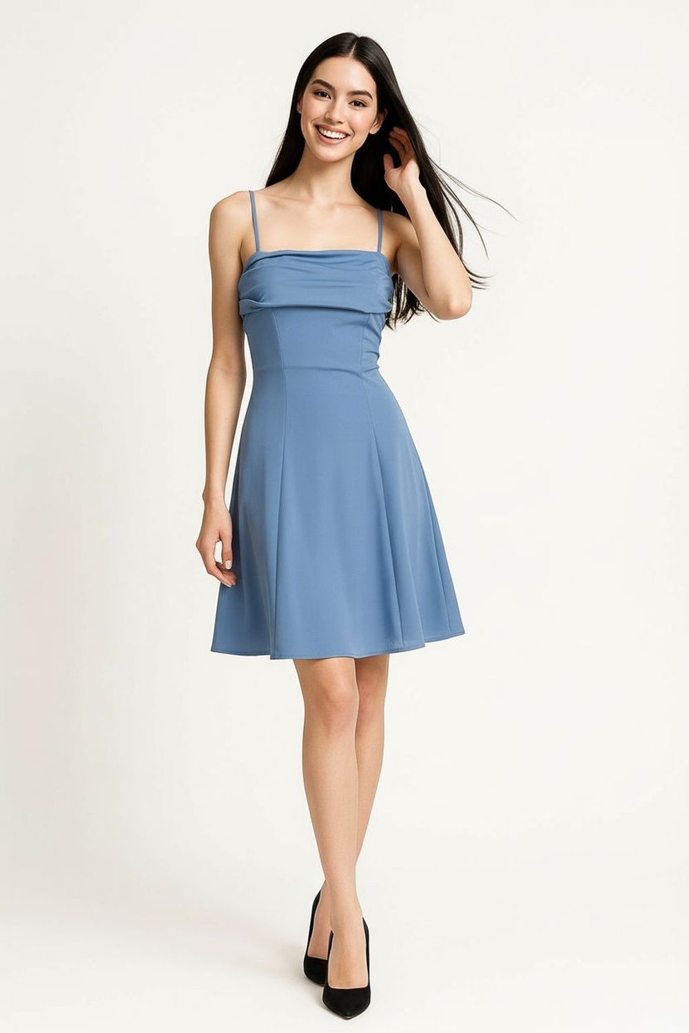 Vestido corto con tirantes delgados escote recto drapeado en la parte superior corte entallado en torso falda con caída fluida