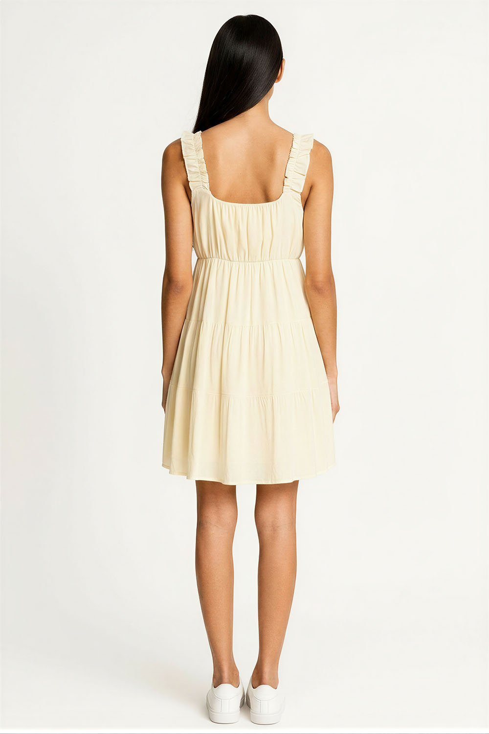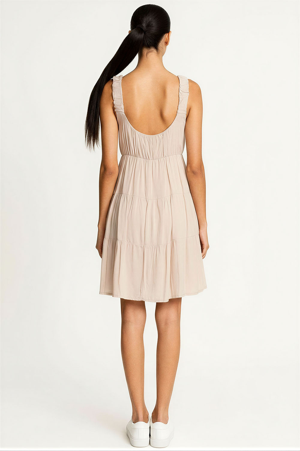 Vestido corto con tirantes anchos que brindan soporte, escote recto con detalle fruncido que aporta ajuste, corte amplio con caída ligera que permite libertad de movimiento, diseño con secciones en capas que agregan volumen, confección en tejido ligero que favorece frescura y comodidad