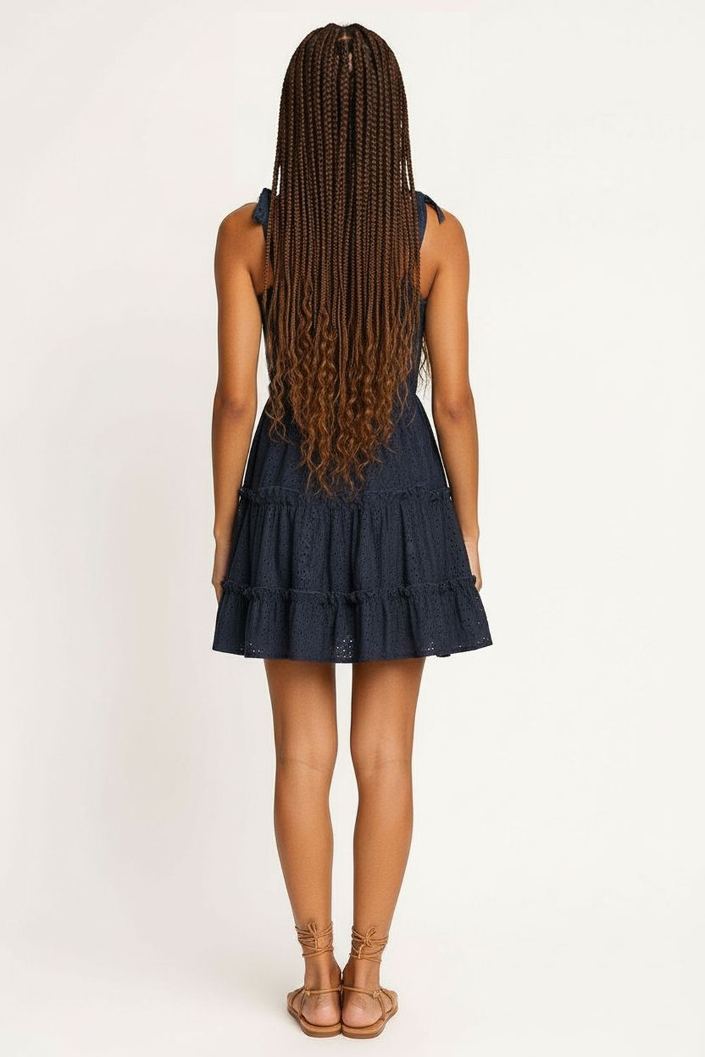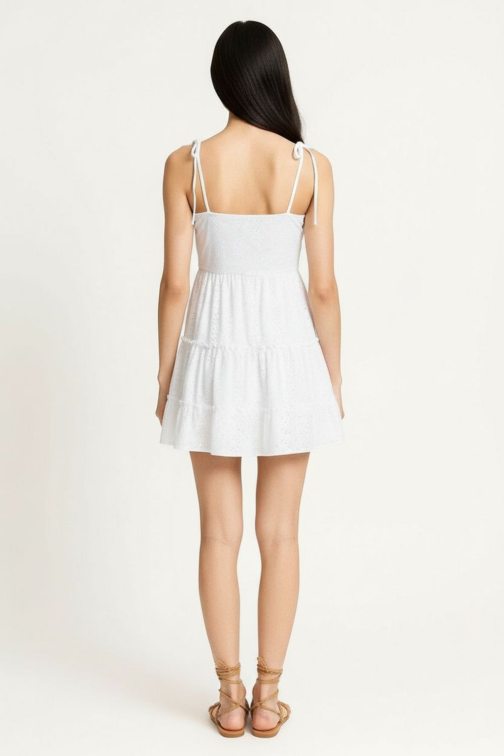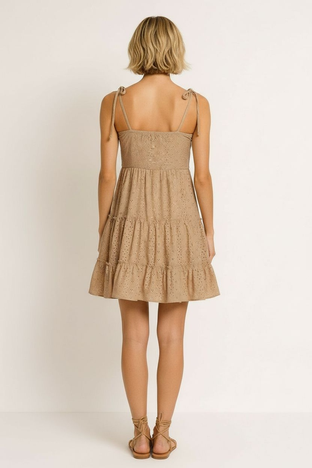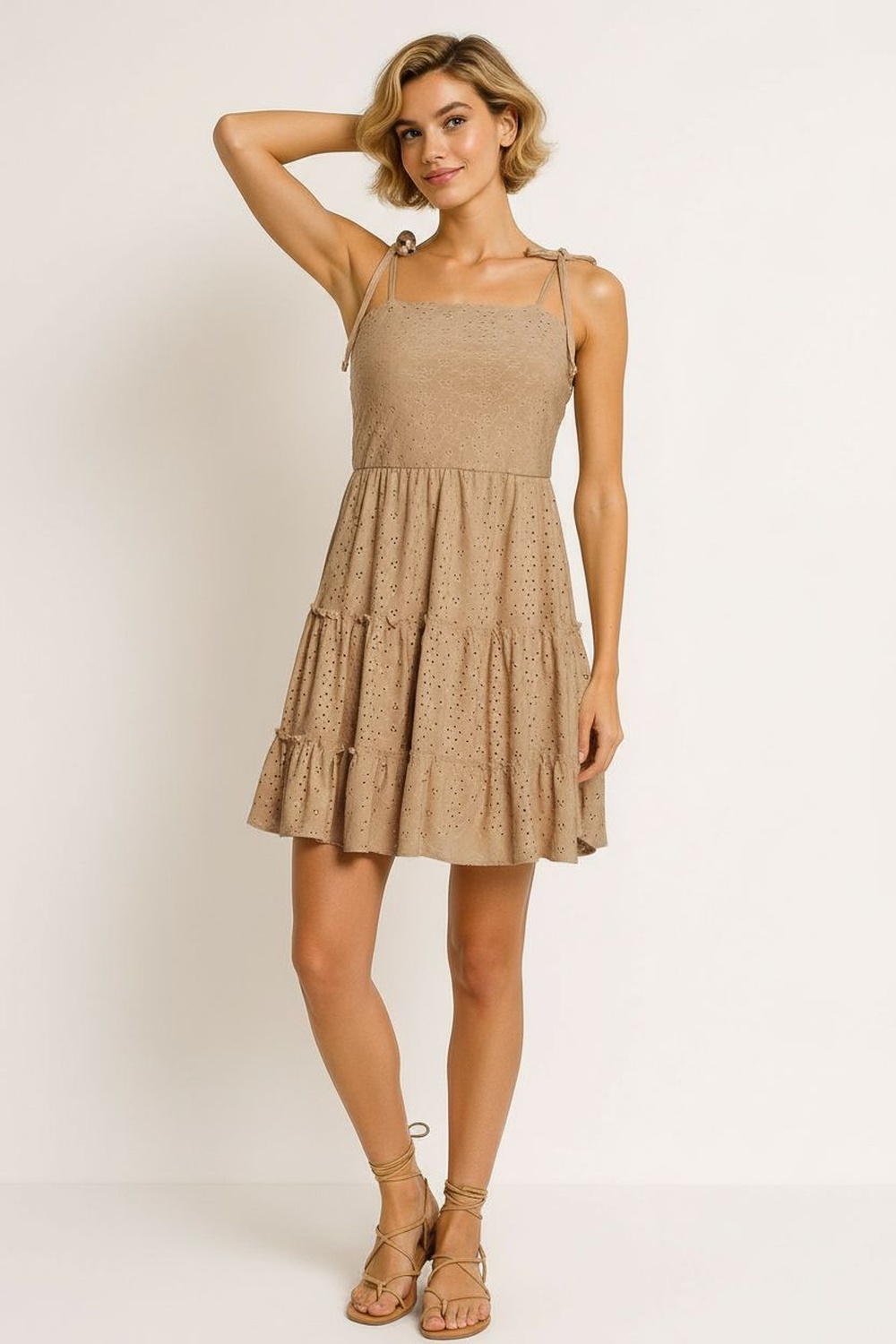 Vestido corto con escote recto y tirantes ajustables que permiten mejor adaptación, corte a la cintura que define la silueta, falda con olanes que aportan movimiento, confección en tejido ligero con textura perforada y sensación fresca