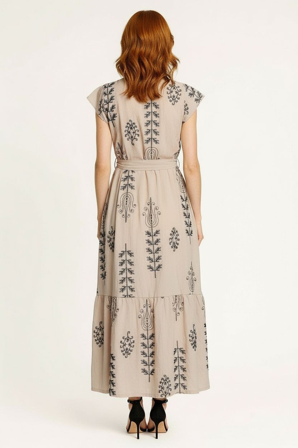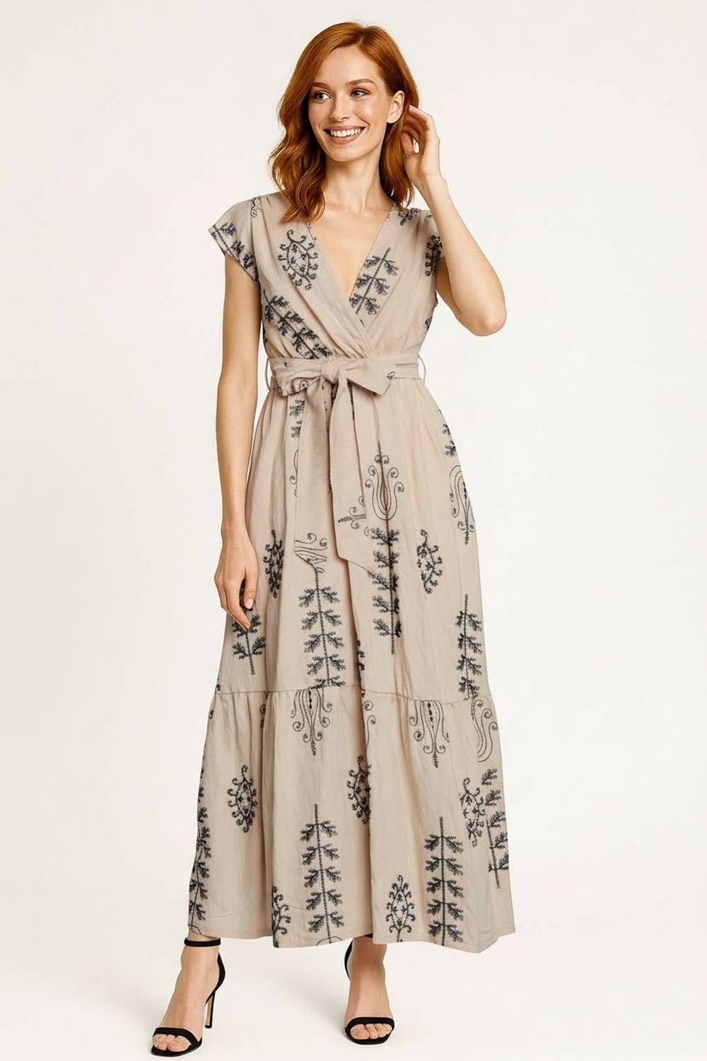 Vestido de largo midi con escote cruzado que define el área superior, ajuste en cintura mediante lazo integrado que permite regular la prenda, falda con ligero vuelo que aporta movimiento, confección fresca con caída natural, acabados limpios que mejoran la presentación