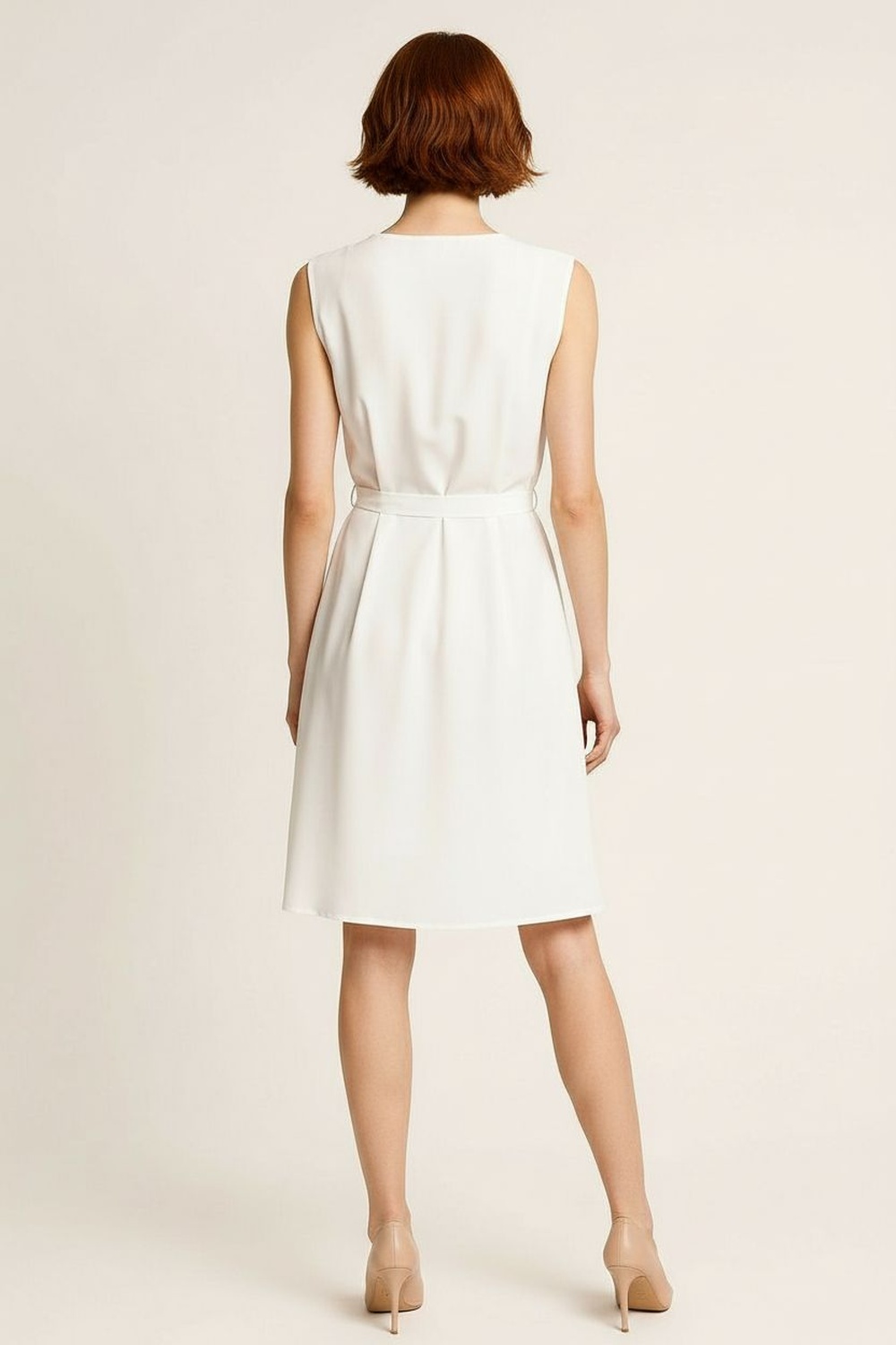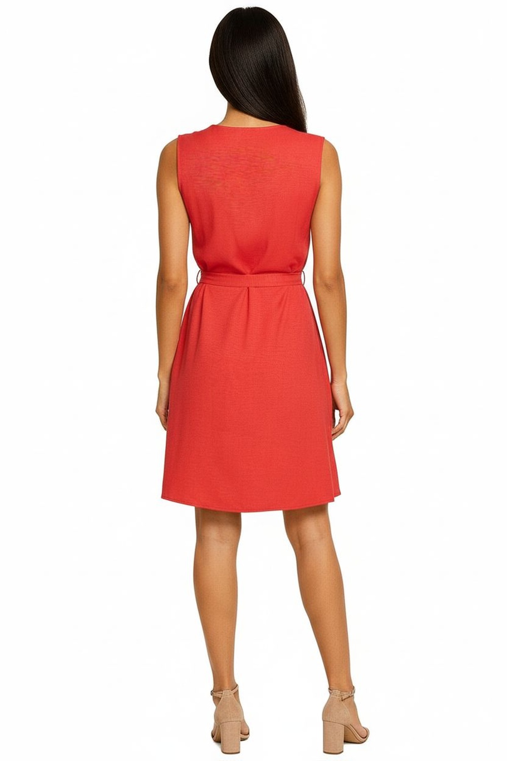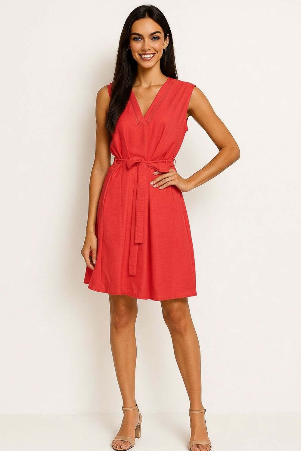 Vestido sin manga con escote en v detalle de costuras al frente y fajilla ajustable en cintura falda con caída ligera