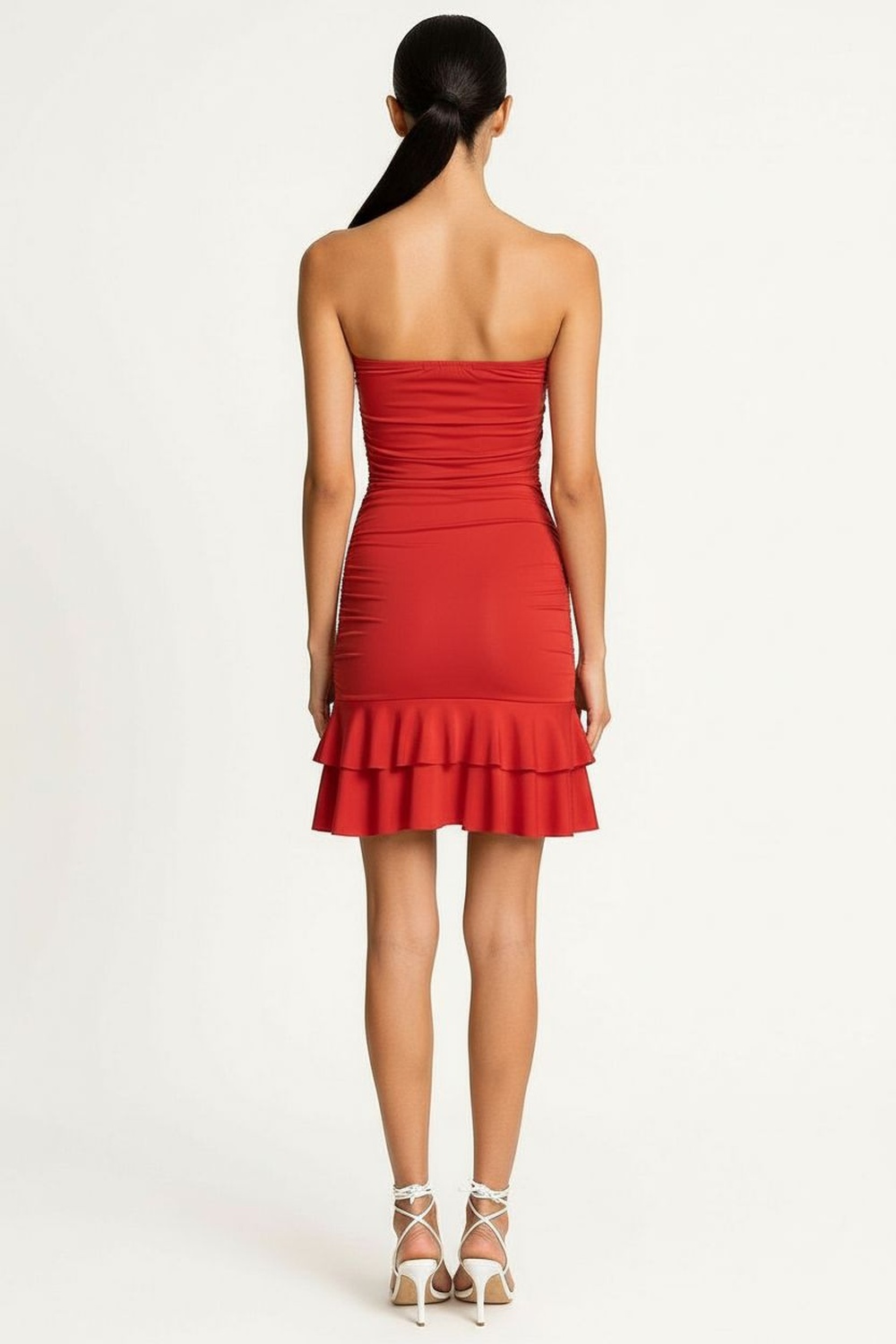 Vestido tubo strapless con ajuste ceñido al cuerpo, confección en tela elástica que moldea la silueta, drapeado estratégico en torso y cadera que aporta mejor definición, faldón con olan inferior de movimiento ligero que añade dinamismo al diseño, largo corto con acabado uniforme y cómodo al contacto con la piel