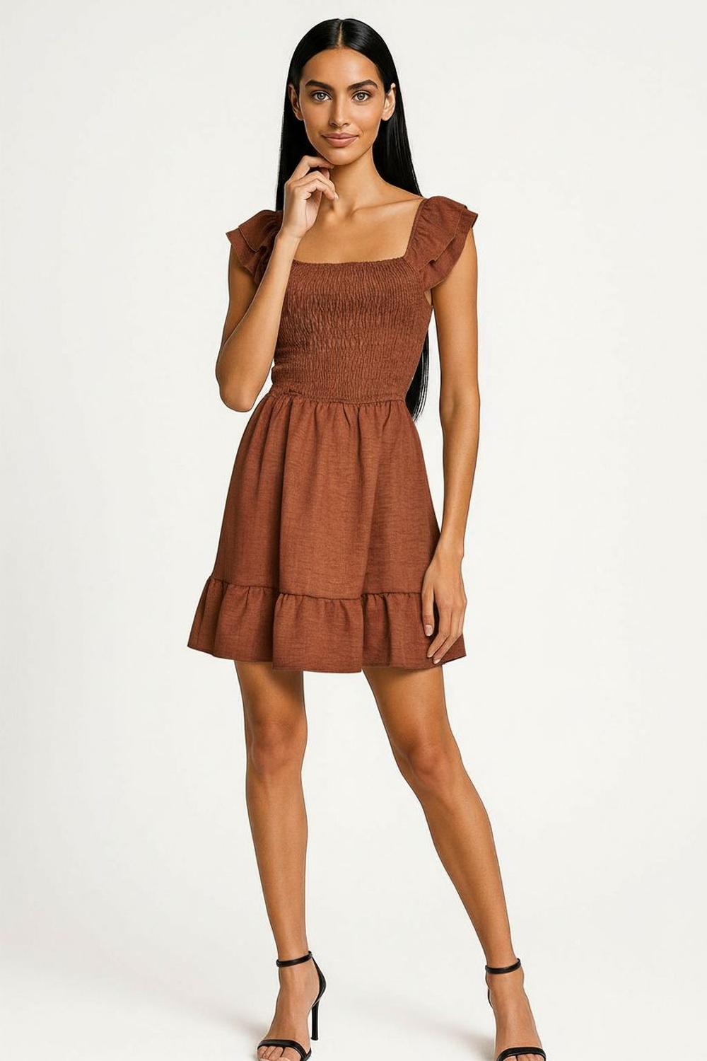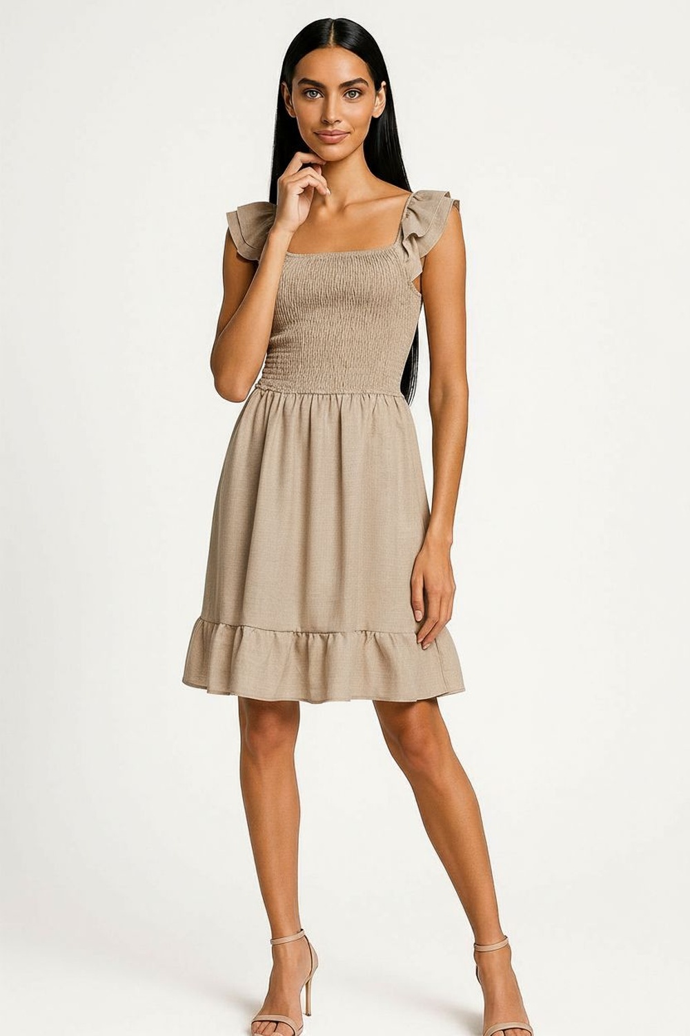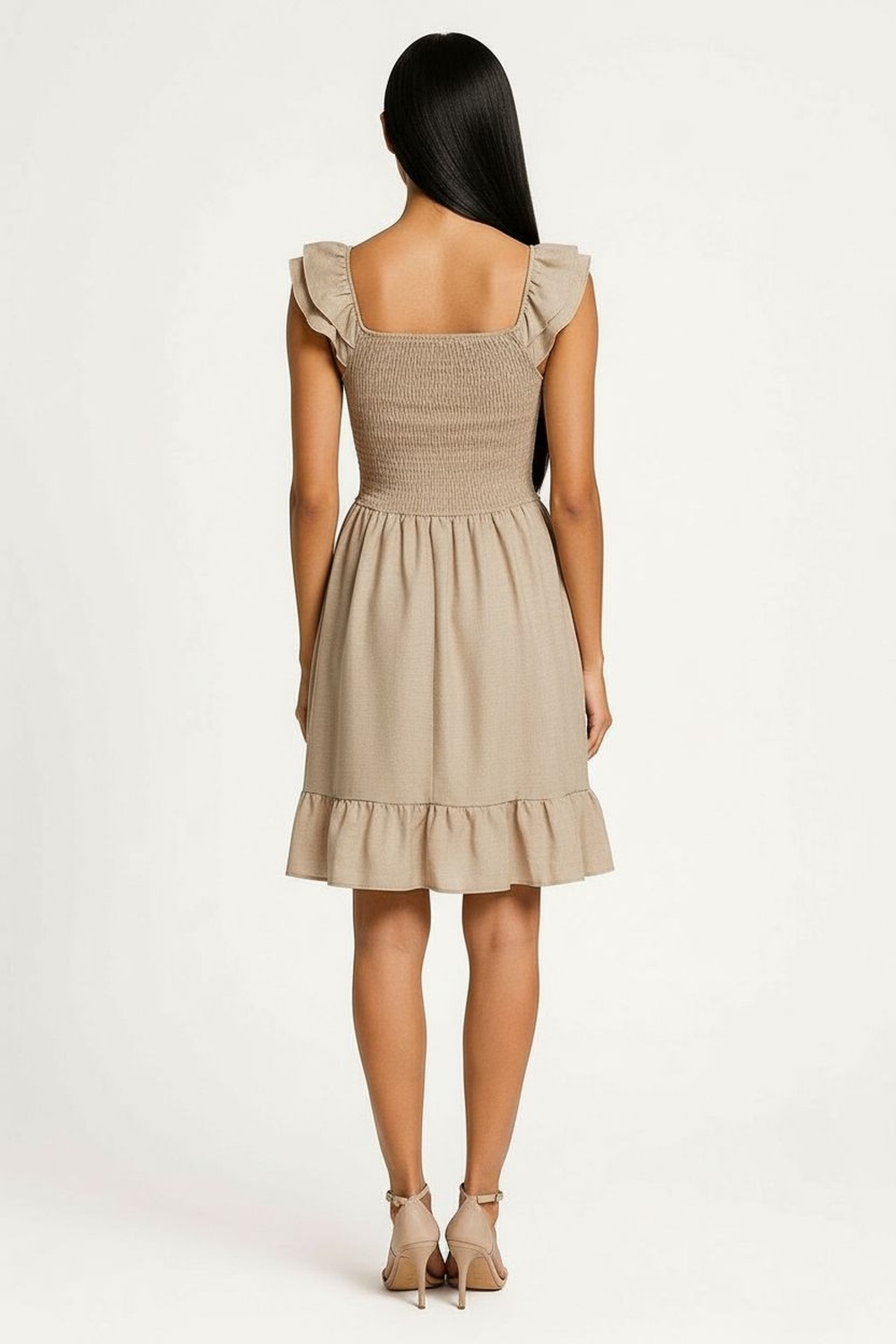 Vestido enresortado con cuerpo fruncido, tirantes con vuelo, cuello recto y falda con corte recogido y detalle de holán en el bajo