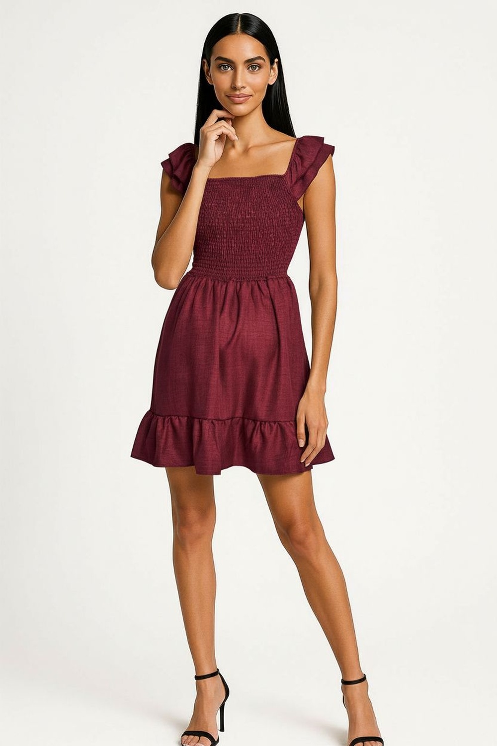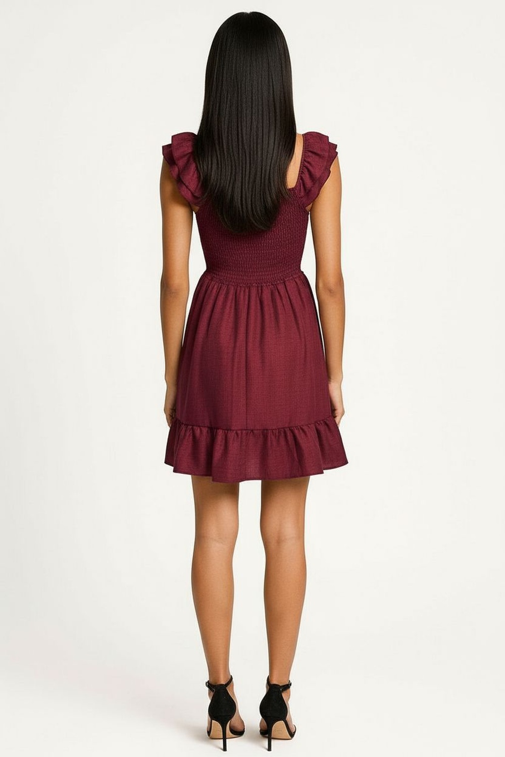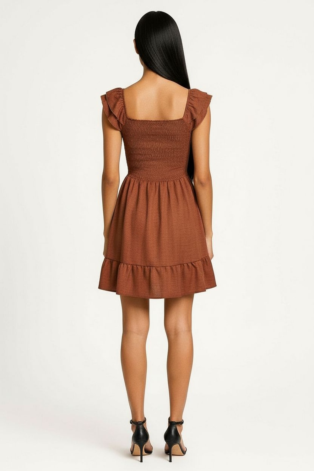 Vestido enresortado con cuerpo fruncido, tirantes con vuelo, cuello recto y falda con corte recogido y detalle de holán en el bajo