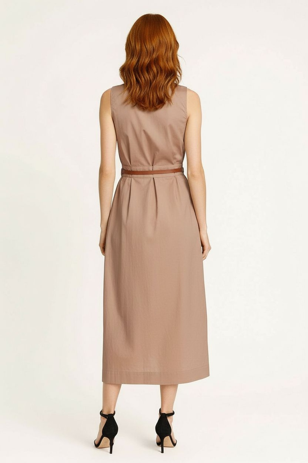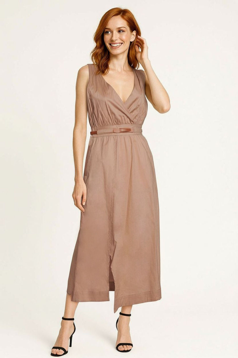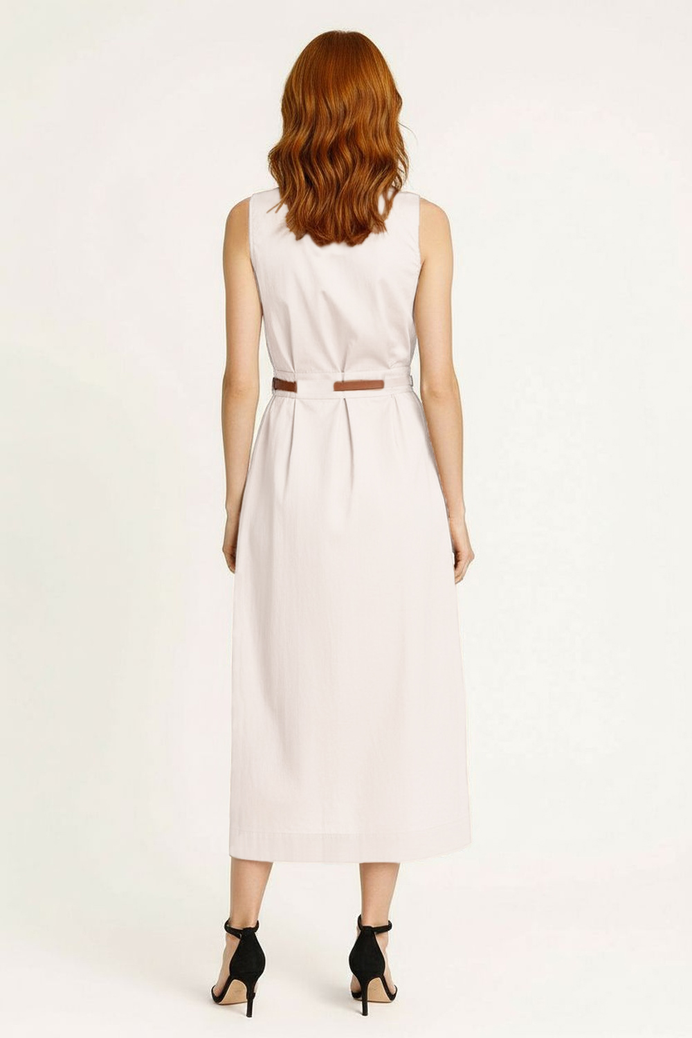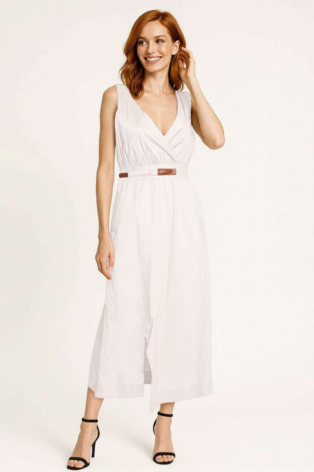 Vestido de largo midi con escote en V que estiliza el torso, cintura ajustable mediante cinturón integrado que aporta estructura, falda con abertura frontal que permite movilidad, confección ligera con caída uniforme, acabados cuidados que elevan la prenda