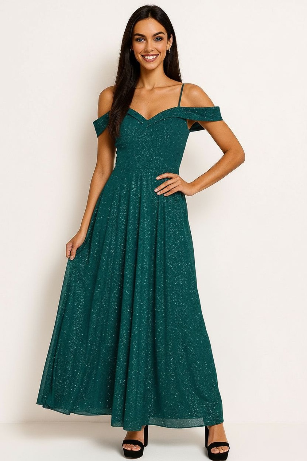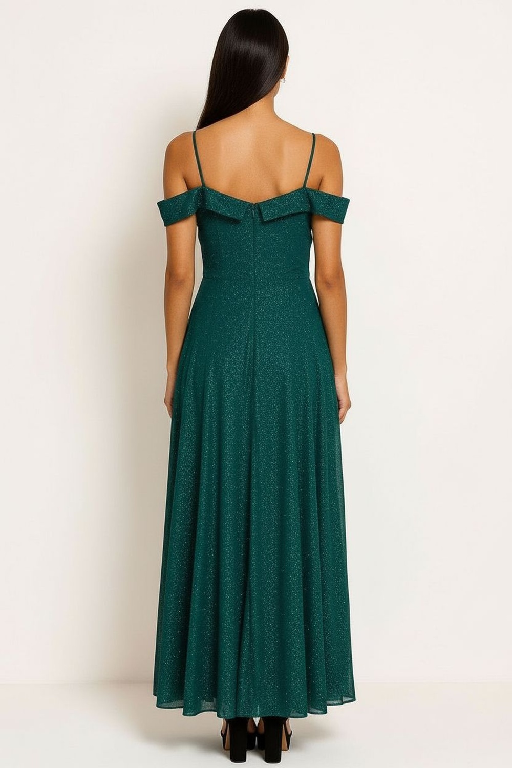 Vestido con tirantes delgados, escote con detalle estructurado, falda larga con plisado uniforme que aporta movimiento, ajuste superior entallado