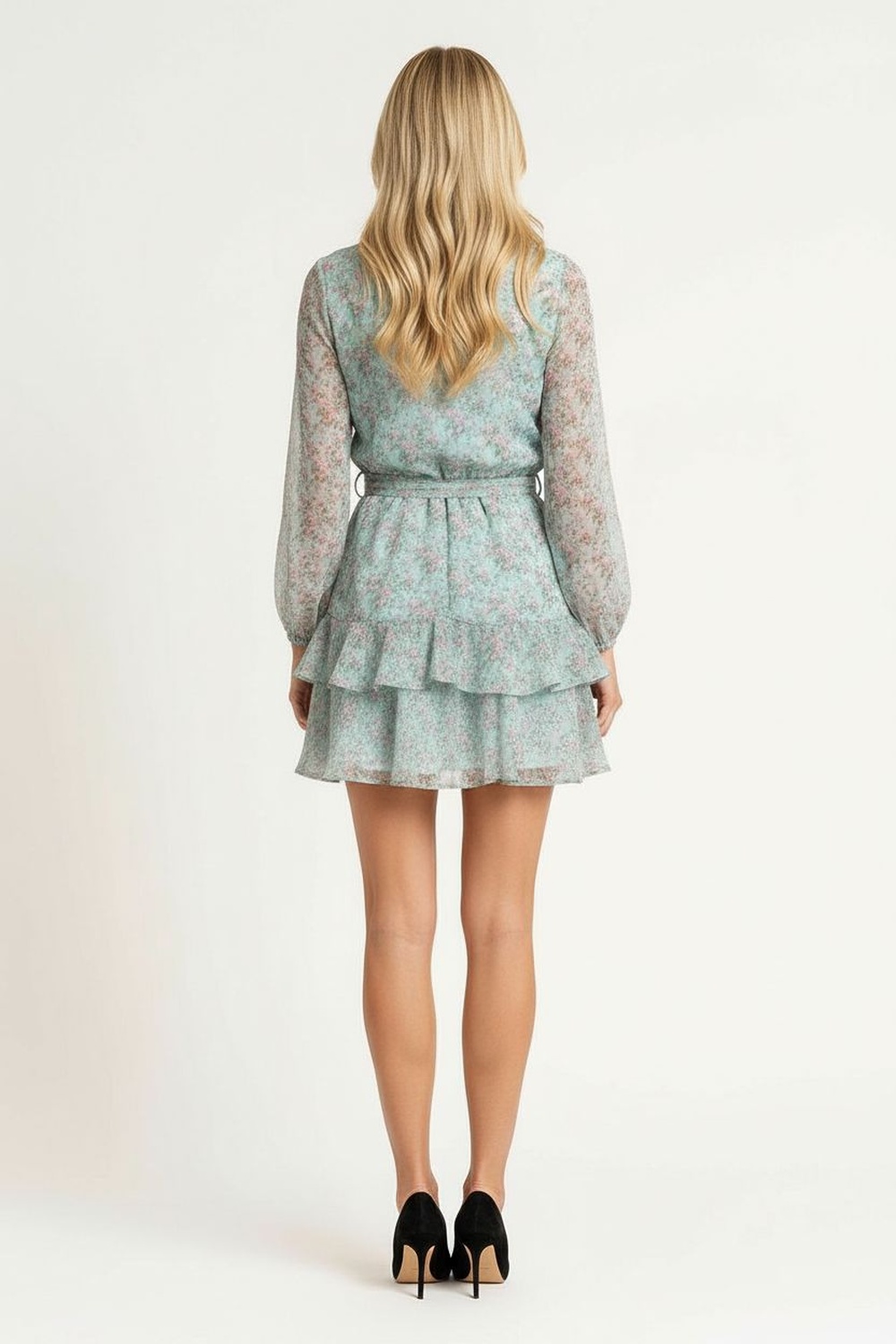 Vestido confeccionado en gasa ligera con forro interno que brinda comodidad, escote en V cruzado que realza el cuello, cintura ajustable con cinturón del mismo tejido que define la silueta, falda con capas suaves que aportan movimiento y un acabado delicado, mangas largas con elástico en puño que ofrecen ajuste cómodo