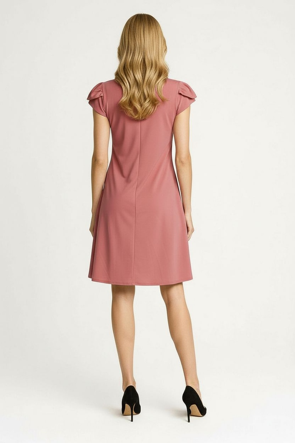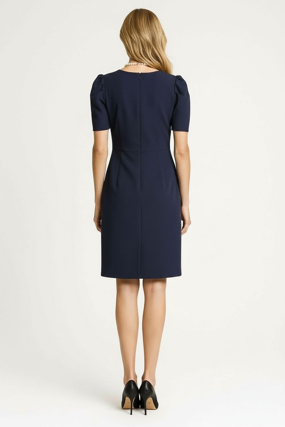 Vestido de manga corta con escote redondo, detalle en cuello con aplicación, corte recto, largo arriba de la rodilla, ajuste cómodo