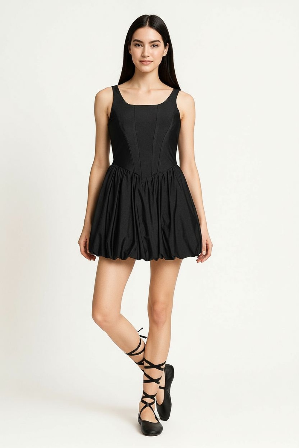Vestido corto confeccionado en tela estructurada con efecto globo en la falda, tirantes anchos que brindan soporte, escote cuadrado que aporta equilibrio visual, corte ajustado en cintura que realza la silueta y moño decorativo en la parte posterior que añade un toque distintivo
