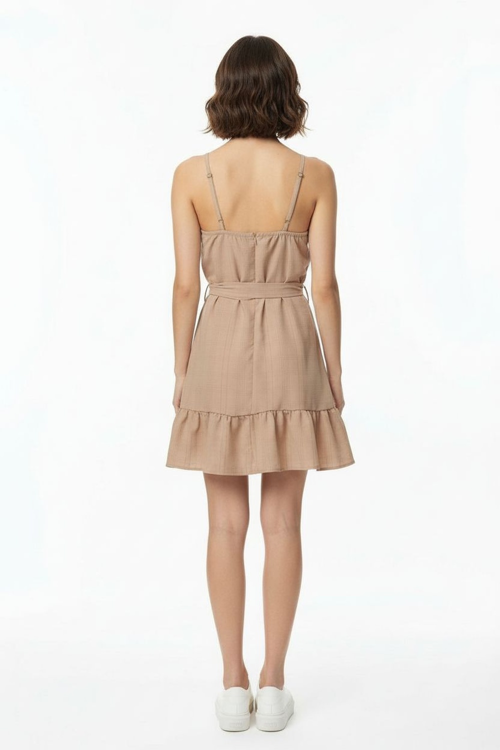 Vestido corto de tirantes delgados con ajuste regulable, escote recto que brinda estructura al torso, corte a la cintura que define la silueta, falda amplia con caída fluida que aporta movimiento natural, confección en tejido ligero que ofrece frescura y comodidad durante todo el día, diseño funcional pensado para uso continuo con sensación suave al tacto